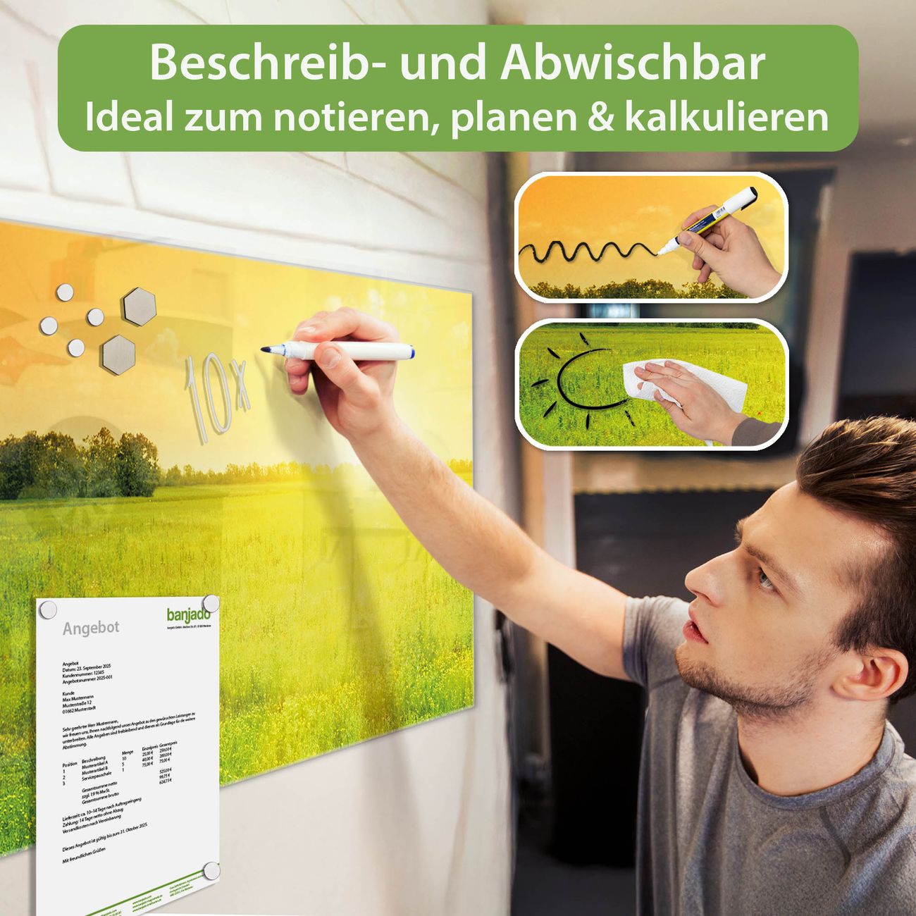 Die banjado Glas Magnettafel mit dem Motiv Motiv Guten Morgen 2 verbindet Funktionalität mit Stil. Sie ersetzt das Zettelchaos durch klare Strukturen und bringt dabei eine warme, natürliche Atmosphäre in Ihr Zuhause. Ob im Büro, in der Küche oder im Eingangsbereich - dieses Design-Board zieht Blicke an und sorgt für Ordnung mit Charakter.