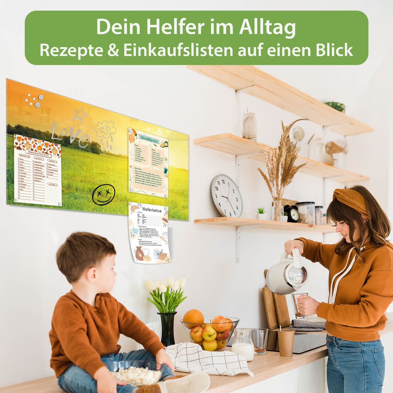 Auf der glatten Glasoberfläche lassen sich Termine, Rezepte oder Notizen ganz einfach mit Kreidestiften festhalten und rückstandslos entfernen. Starke Neodym-Magnete halten Ihre wichtigsten Erinnerungen sicher an Ort und Stelle. So entsteht Ihre ganz persönliche Ideenwand - jeden Tag neu.