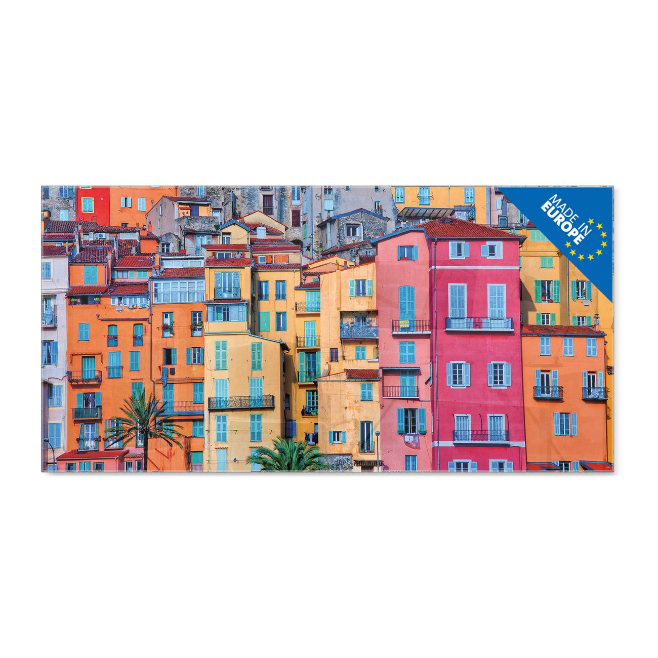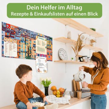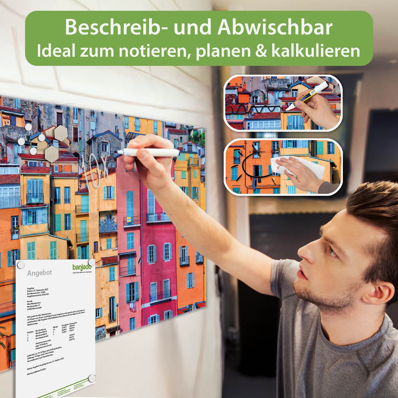 Material: 4mm Sicherheitsglas mit Metallrückwand Eigenschaften: beschreibbar, magnetisch, kratzfest Maße: 100x50x0,6cm, 7,50kg schwer Motiv Nummer 10865 Häuserberg Zubehör: inklusive 4 Neodym-Magnete
