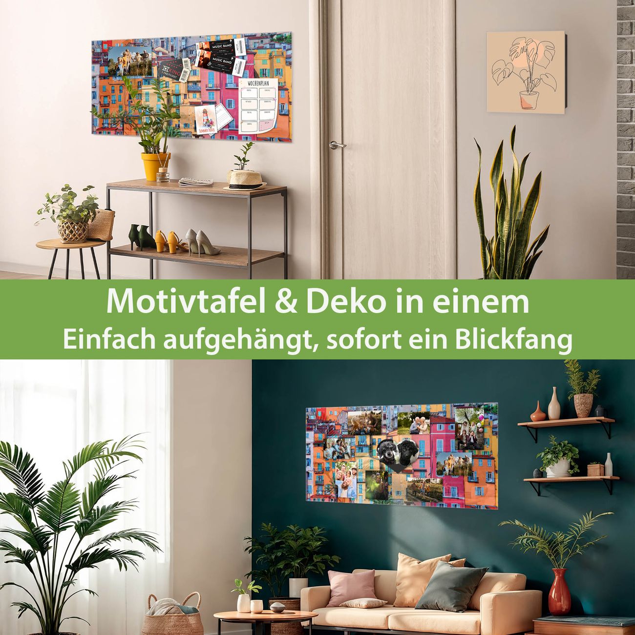 Die banjado Glas Magnettafel mit dem Motiv Motiv Häuserberg verbindet Funktionalität mit Stil. Sie ersetzt das Zettelchaos durch klare Strukturen und bringt dabei eine warme, natürliche Atmosphäre in Ihr Zuhause. Ob im Büro, in der Küche oder im Eingangsbereich - dieses Design-Board zieht Blicke an und sorgt für Ordnung mit Charakter.