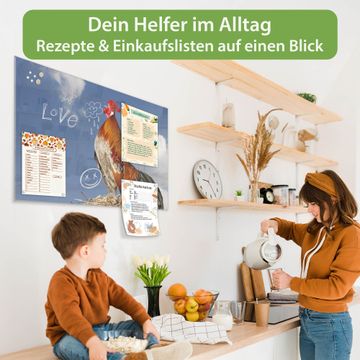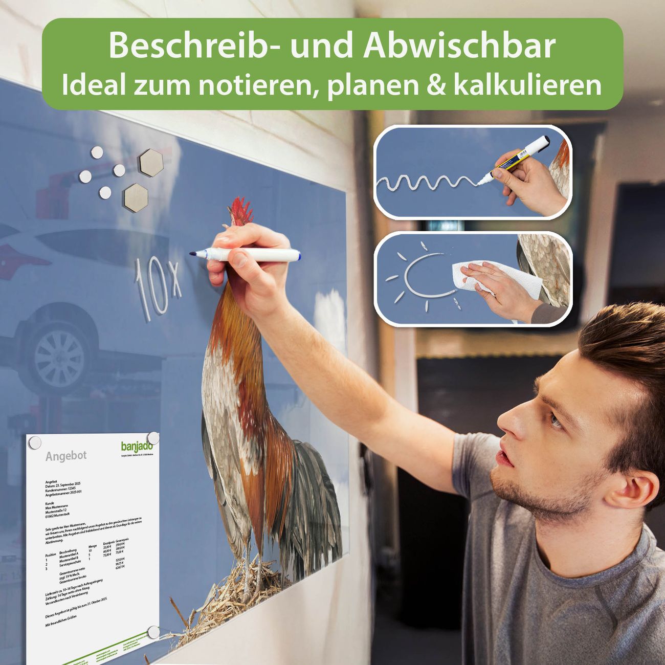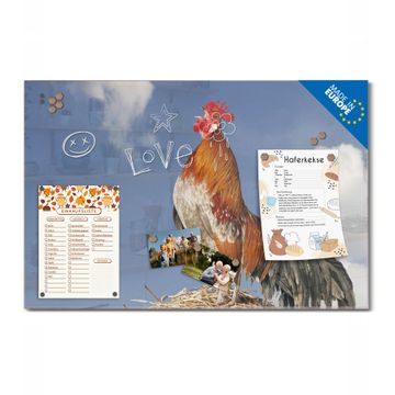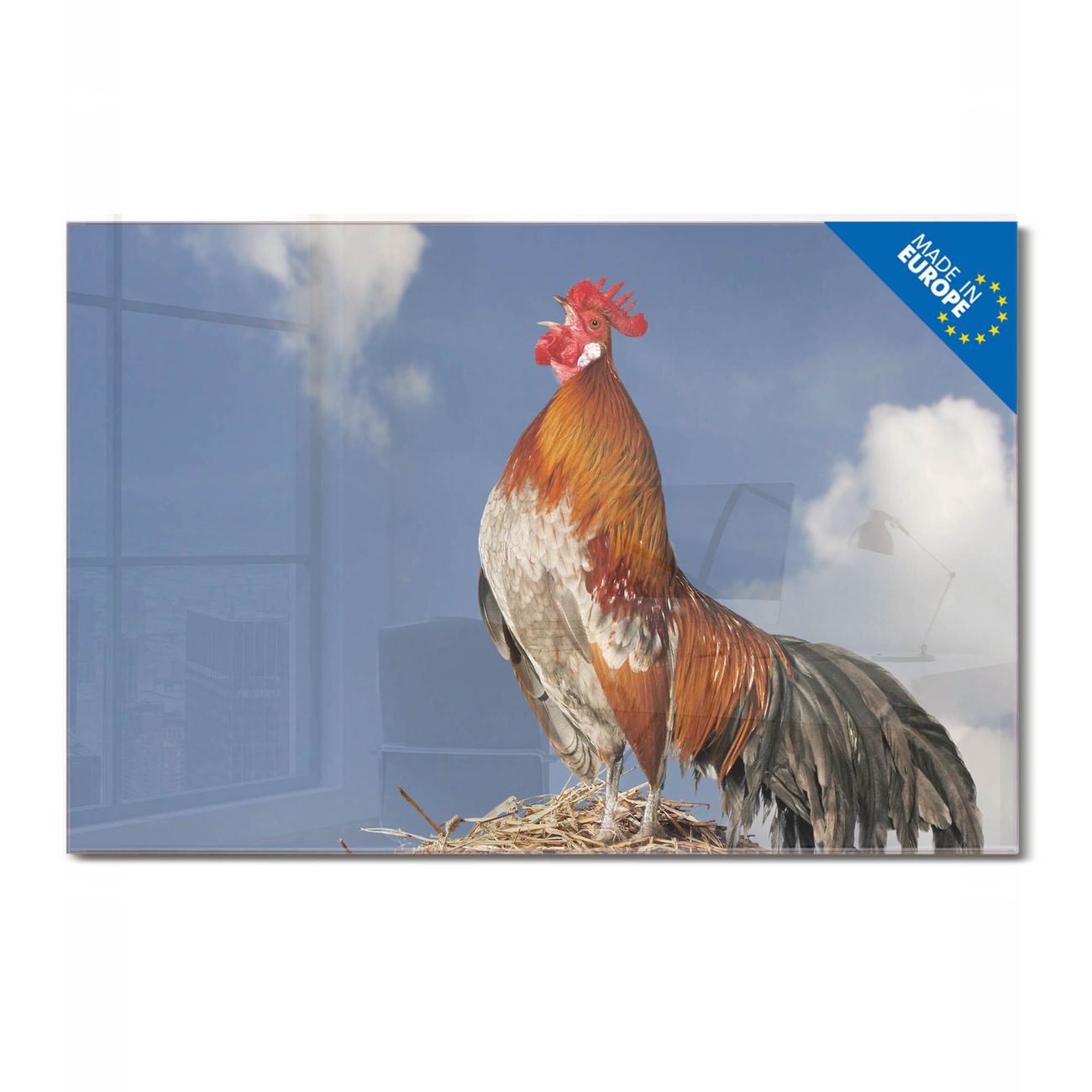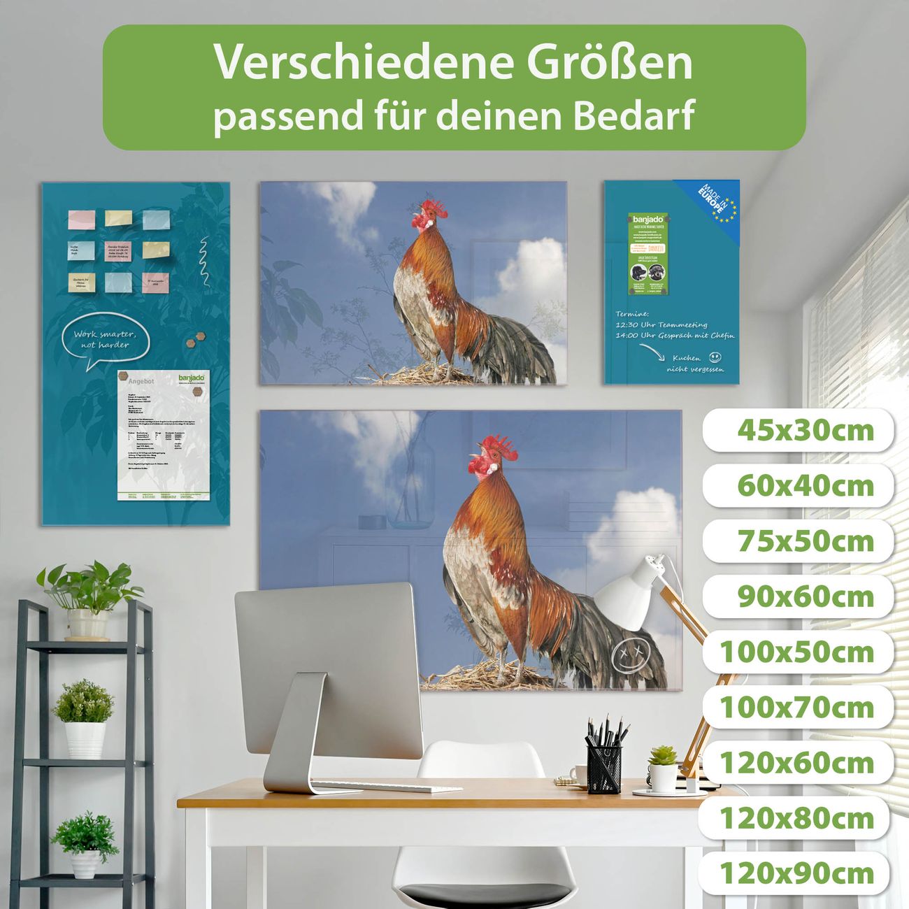 Material: 4mm Sicherheitsglas mit Metallrückwand Eigenschaften: beschreibbar, magnetisch, kratzfest Maße: 75x50x0,6cm, 5,63kg schwer Motiv Nummer 10519 Hahn Zubehör: inklusive 4 Neodym-Magnete