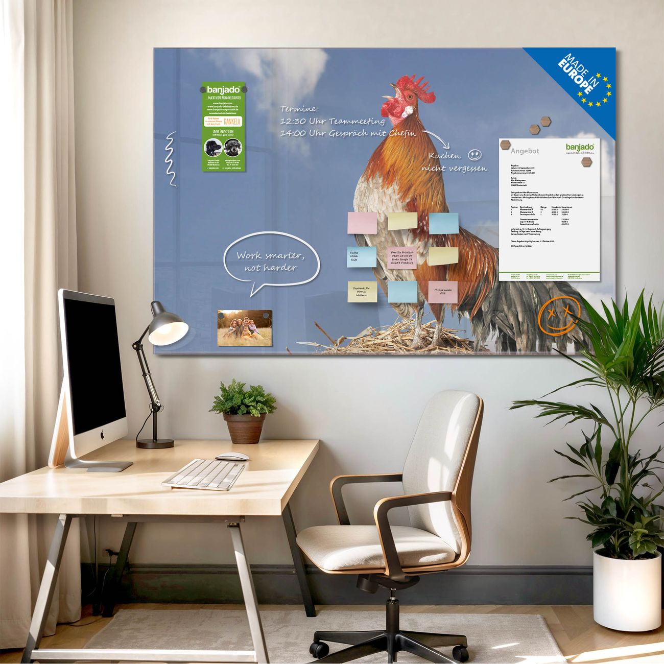 Die banjado Glas Magnettafel mit dem Motiv Motiv Hahn verbindet Funktionalität mit Stil. Sie ersetzt das Zettelchaos durch klare Strukturen und bringt dabei eine warme, natürliche Atmosphäre in Ihr Zuhause. Ob im Büro, in der Küche oder im Eingangsbereich - dieses Design-Board zieht Blicke an und sorgt für Ordnung mit Charakter.