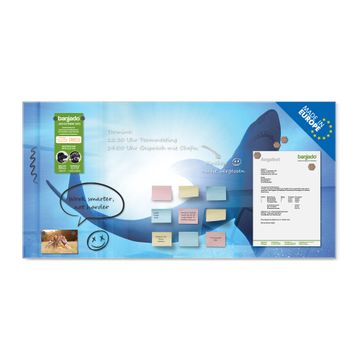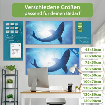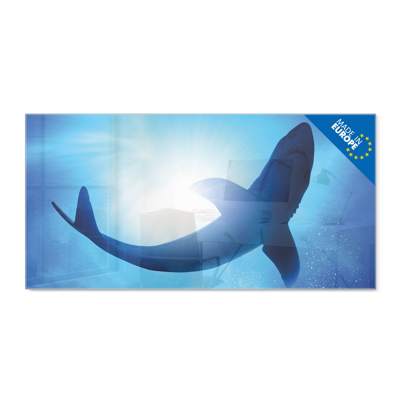 Material: 4mm Sicherheitsglas mit Metallrückwand Eigenschaften: beschreibbar, magnetisch, kratzfest Maße: 120x60x0,6cm, 10,80kg schwer Motiv Nummer 10425 Hai Zubehör: inklusive 4 Neodym-Magnete