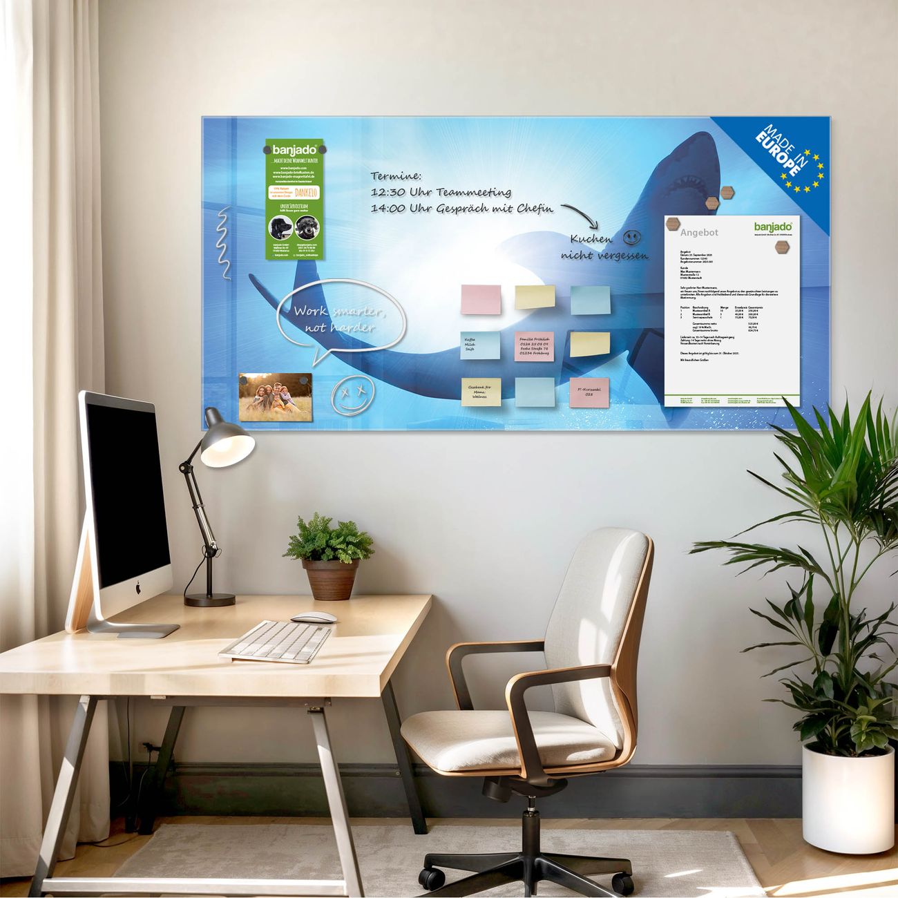 Die banjado Glas Magnettafel mit dem Motiv Motiv Hai verbindet Funktionalität mit Stil. Sie ersetzt das Zettelchaos durch klare Strukturen und bringt dabei eine warme, natürliche Atmosphäre in Ihr Zuhause. Ob im Büro, in der Küche oder im Eingangsbereich - dieses Design-Board zieht Blicke an und sorgt für Ordnung mit Charakter.