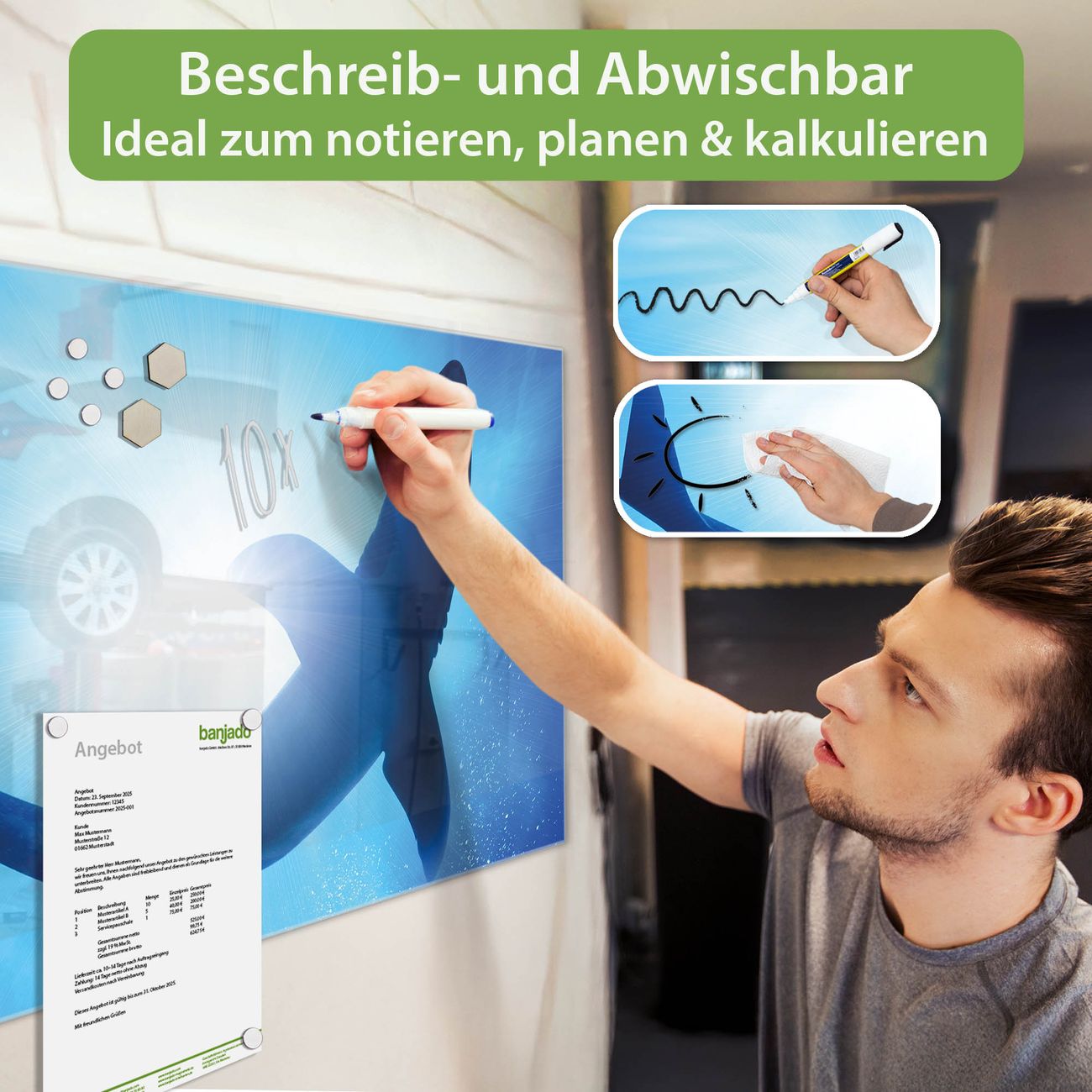 Bitte beachten Sie, dass ausschliessliche spezielle Magnete an der Glastafel haften. Wir empfehlen banjado Neodym Magnete, diese sind durch uns auf Wirksamkeit geprüft.