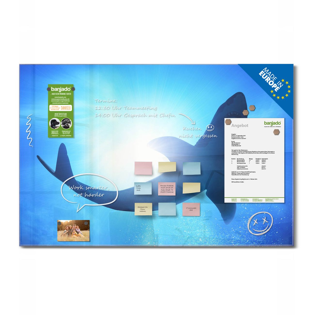 Material: 4mm Sicherheitsglas mit Metallrückwand Eigenschaften: beschreibbar, magnetisch, kratzfest Maße: 120x80x0,6cm, 14,40kg schwer Motiv Nummer 10425 Hai Zubehör: inklusive 4 Neodym-Magnete