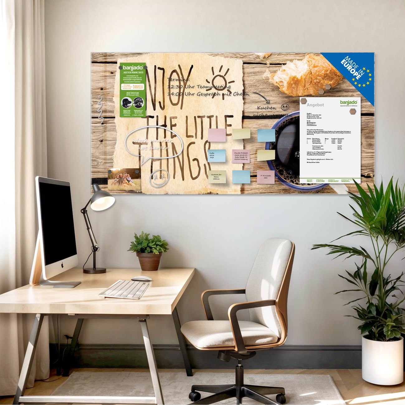 Die banjado Glas Magnettafel mit dem Motiv Motiv Happy Day verbindet Funktionalität mit Stil. Sie ersetzt das Zettelchaos durch klare Strukturen und bringt dabei eine warme, natürliche Atmosphäre in Ihr Zuhause. Ob im Büro, in der Küche oder im Eingangsbereich - dieses Design-Board zieht Blicke an und sorgt für Ordnung mit Charakter.