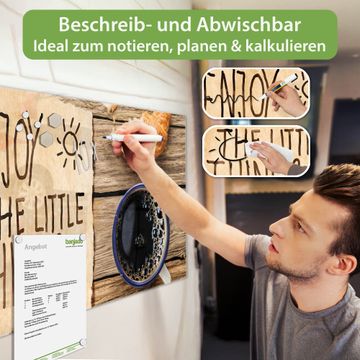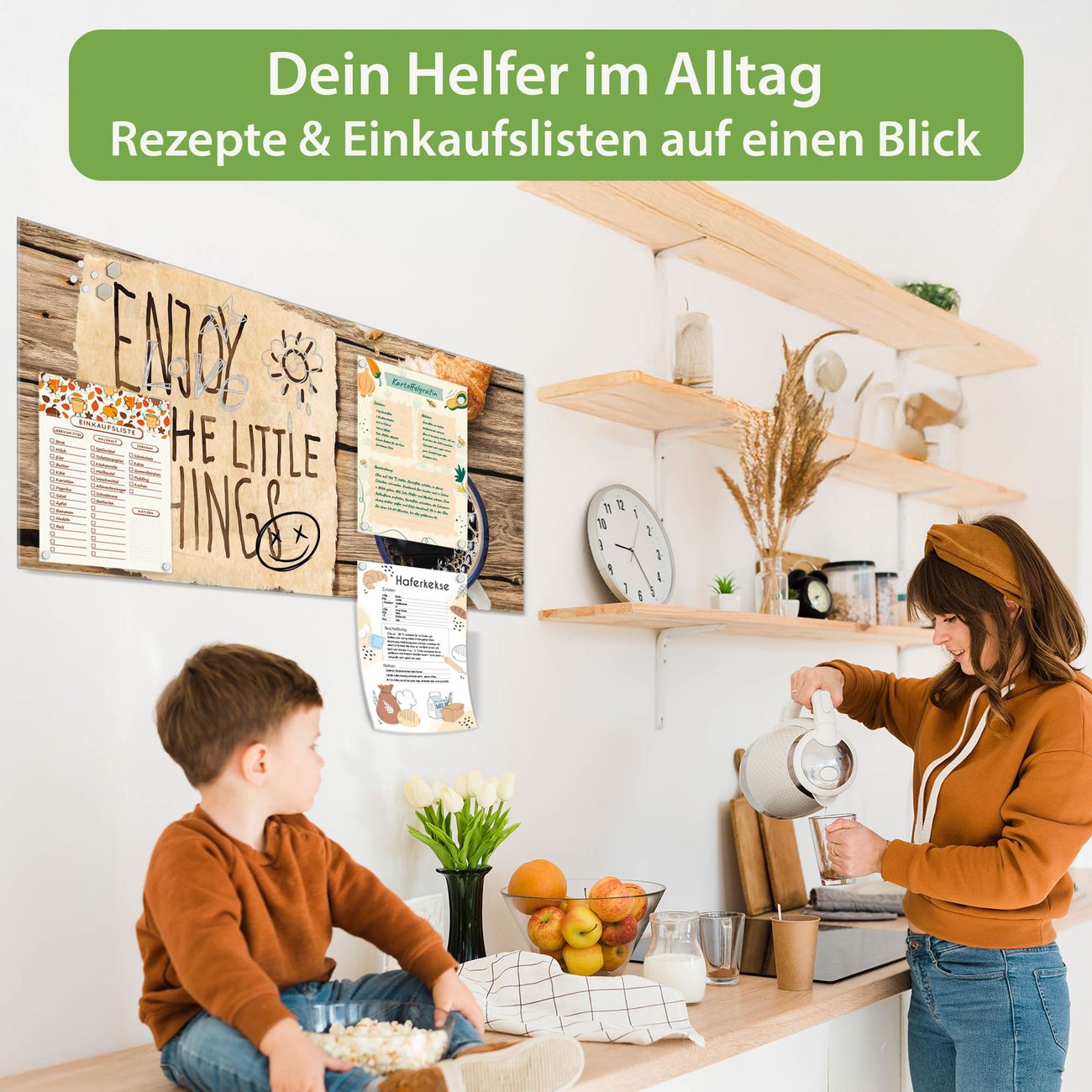 Auf der glatten Glasoberfläche lassen sich Termine, Rezepte oder Notizen ganz einfach mit Kreidestiften festhalten und rückstandslos entfernen. Starke Neodym-Magnete halten Ihre wichtigsten Erinnerungen sicher an Ort und Stelle. So entsteht Ihre ganz persönliche Ideenwand - jeden Tag neu.