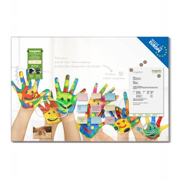 Material: 4mm Sicherheitsglas mit Metallrückwand Eigenschaften: beschreibbar, magnetisch, kratzfest Maße: 120x80x0,6cm, 14,40kg schwer Motiv Nummer 10310 Happy Hands Zubehör: inklusive 4 Neodym-Magnete