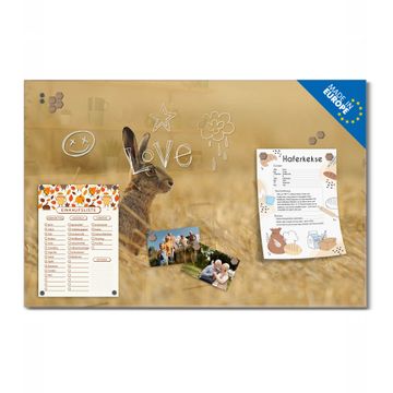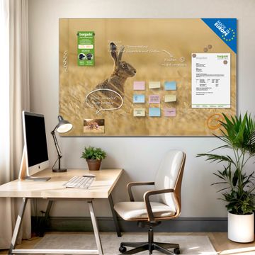 Material: 4mm Sicherheitsglas mit Metallrückwand Eigenschaften: beschreibbar, magnetisch, kratzfest Maße: 75x50x0,6cm, 5,63kg schwer Motiv Nummer 10496 Hase Zubehör: inklusive 4 Neodym-Magnete