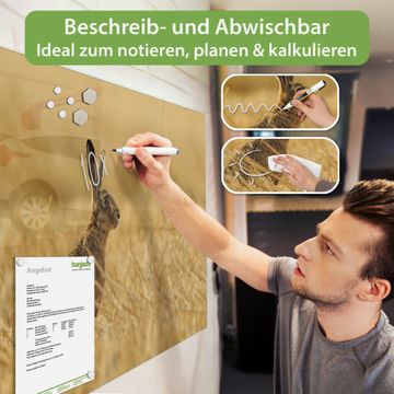 Die banjado Glas Magnettafel mit dem Motiv Motiv Hase verbindet Funktionalität mit Stil. Sie ersetzt das Zettelchaos durch klare Strukturen und bringt dabei eine warme, natürliche Atmosphäre in Ihr Zuhause. Ob im Büro, in der Küche oder im Eingangsbereich - dieses Design-Board zieht Blicke an und sorgt für Ordnung mit Charakter.