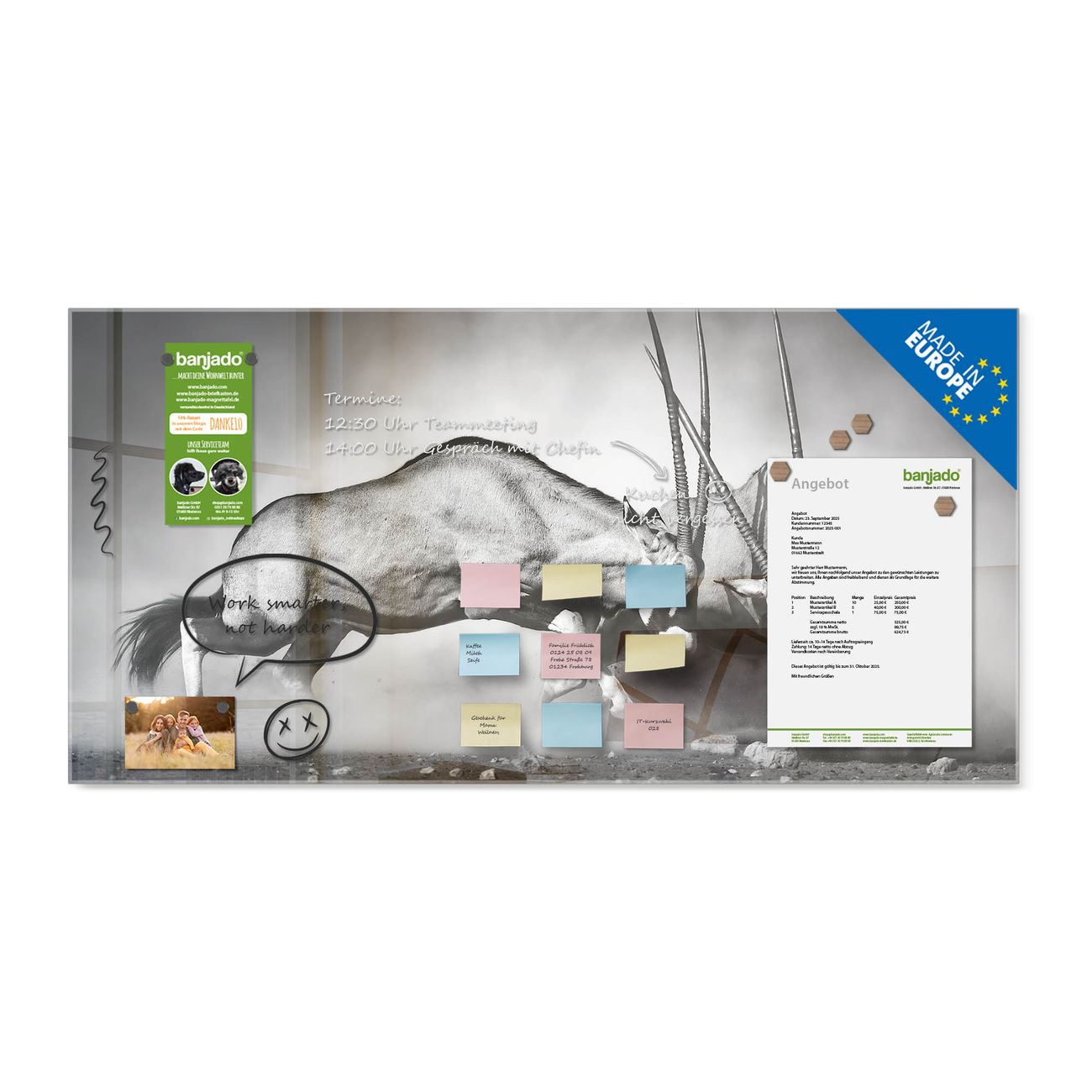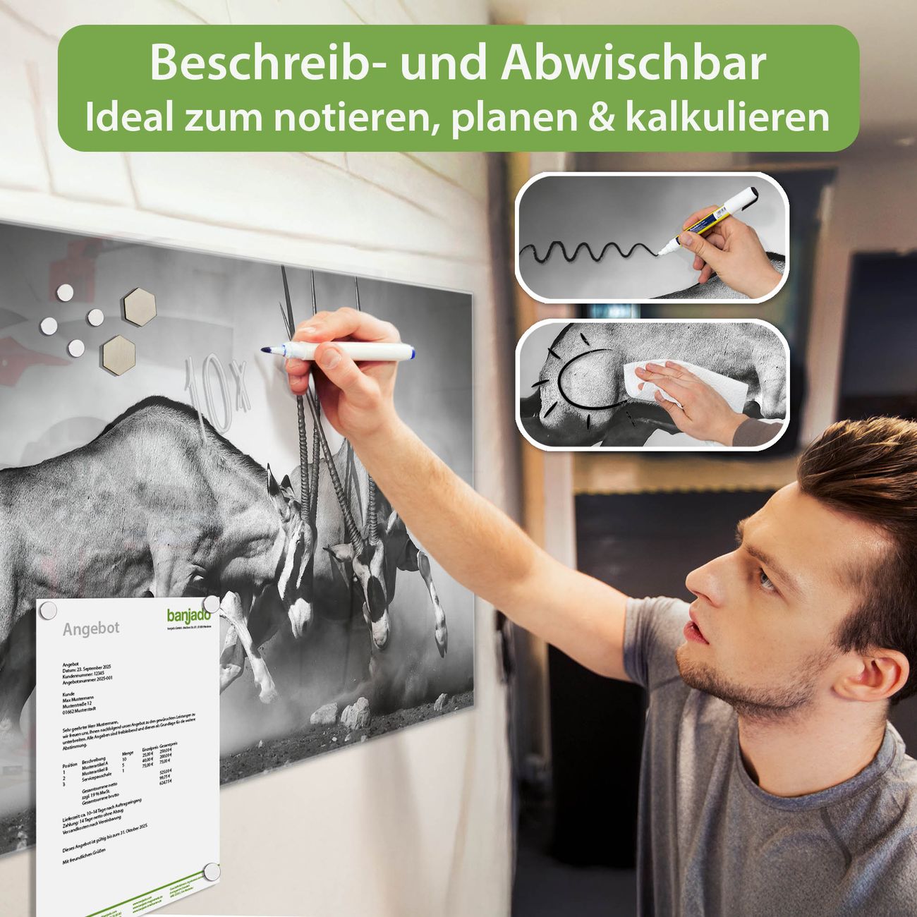 Bitte beachten Sie, dass ausschliessliche spezielle Magnete an der Glastafel haften. Wir empfehlen banjado Neodym Magnete, diese sind durch uns auf Wirksamkeit geprüft.