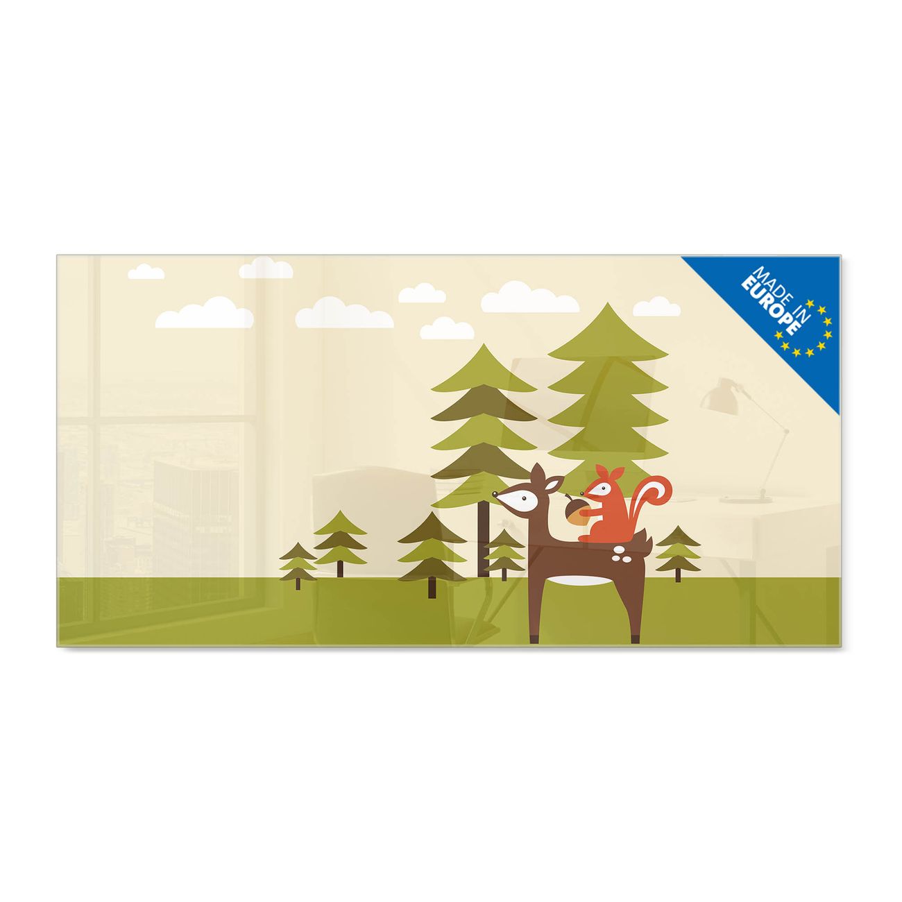 Material: 4mm Sicherheitsglas mit Metallrückwand Eigenschaften: beschreibbar, magnetisch, kratzfest Maße: 100x50x0,6cm, 7,50kg schwer Motiv Nummer 11010 Heimweg Zubehör: inklusive 4 Neodym-Magnete