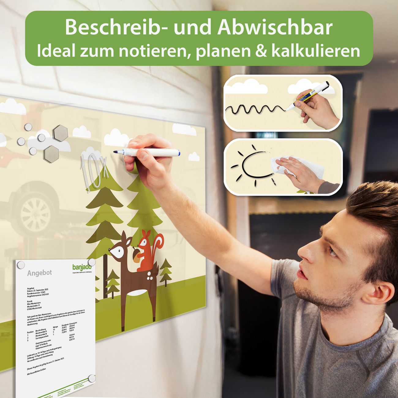 Jede Glas Magnettafel wird in unserer Werkstatt von Hand gefertigt und sorgfältig geprüft. So erhalten Sie ein echtes Qualitätsprodukt, das Funktion und Ästhetik perfekt vereint.?? Warum banjado?