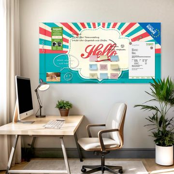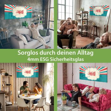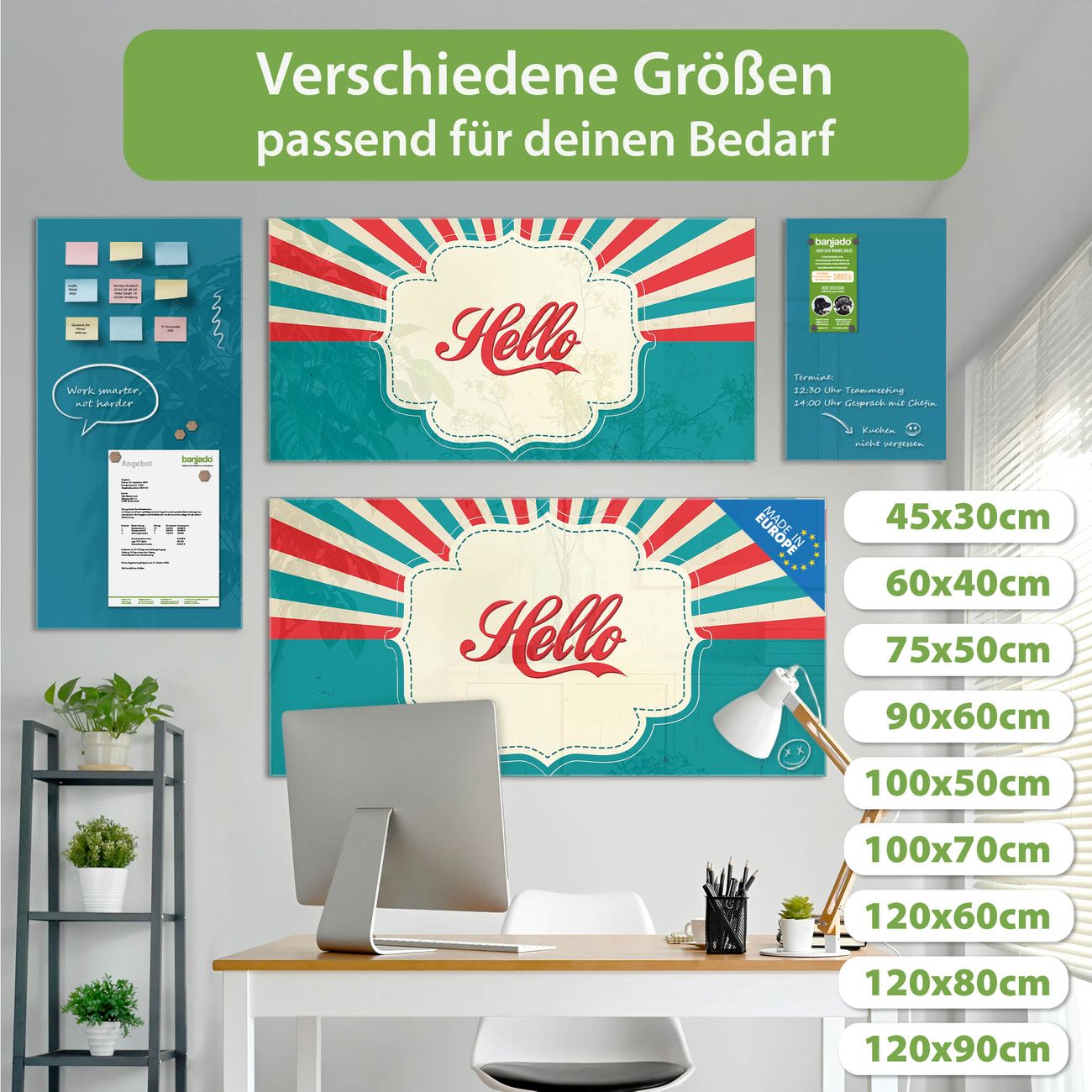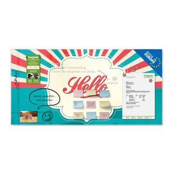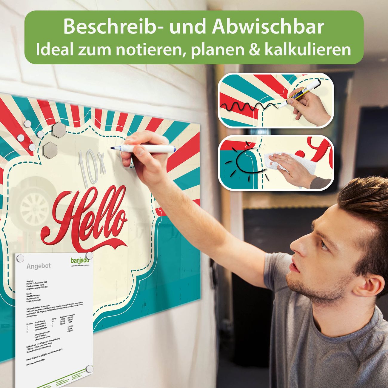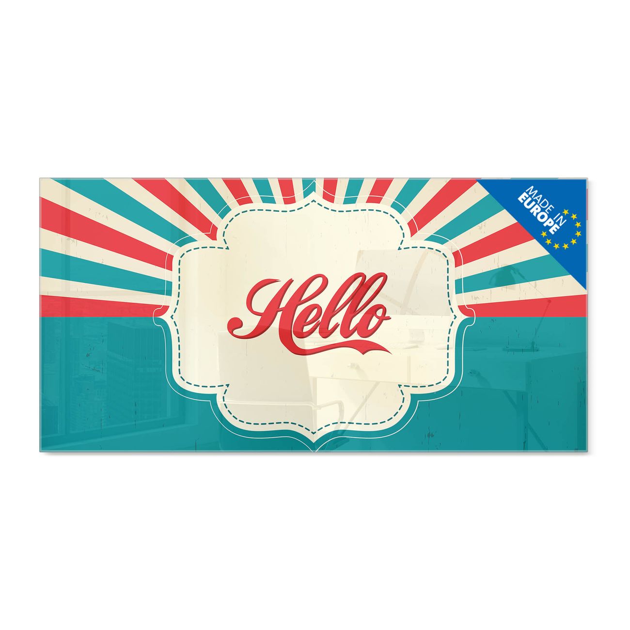 Material: 4mm Sicherheitsglas mit Metallrückwand Eigenschaften: beschreibbar, magnetisch, kratzfest Maße: 100x50x0,6cm, 7,50kg schwer Motiv Nummer 10741 Hello Zubehör: inklusive 4 Neodym-Magnete