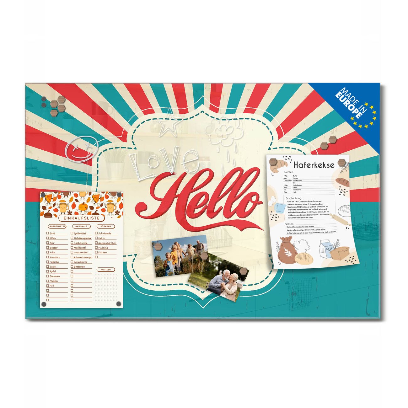 Material: 4mm Sicherheitsglas mit Metallrückwand Eigenschaften: beschreibbar, magnetisch, kratzfest Maße: 75x50x0,6cm, 5,63kg schwer Motiv Nummer 10741 Hello Zubehör: inklusive 4 Neodym-Magnete