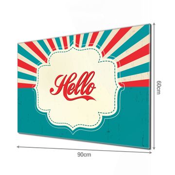 Material: 4mm Sicherheitsglas mit Metallrückwand Eigenschaften: beschreibbar, magnetisch, kratzfest Maße: 90x60x0,6cm, 8,10kg schwer Motiv Nummer 10741 Hello Zubehör: inklusive 4 Neodym-Magnete