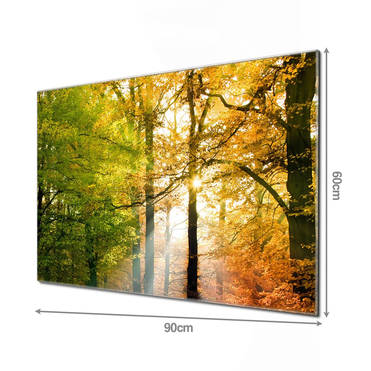 Material: 4mm Sicherheitsglas mit Metallrückwand Eigenschaften: beschreibbar, magnetisch, kratzfest Maße: 90x60x0,6cm, 8,10kg schwer Motiv Nummer 10041 Herbstwald Zubehör: inklusive 4 Neodym-Magnete