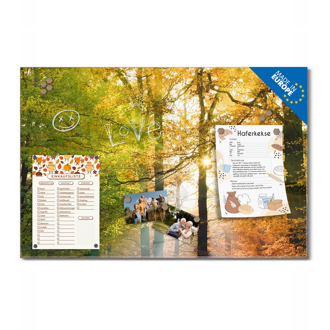 Ein Stück Design, das Ihren Alltag organisiert. Schreiben, heften, inspirieren - alles an einem Ort. Qualität, die man spürt. Montage leicht gemacht. Handwerk mit Herz - veredelt in Sachsen. Einzigartiges Design mit Motiv Motiv Herbstwald Beschreibbare Glasoberfläche, leicht zu reinigen Starke Magnetkraft durch Stahlrückwand Inklusive 4 Neodym-Magneten Flexible Montageoptionen Handveredelt in Sachsen - Qualität, die bleibt