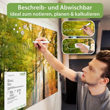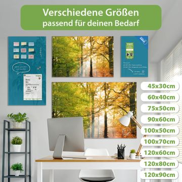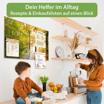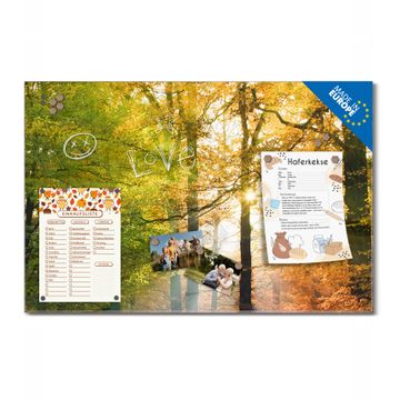 Material: 4mm Sicherheitsglas mit Metallrückwand Eigenschaften: beschreibbar, magnetisch, kratzfest Maße: 45x30x0,6cm, 2,03kg schwer Motiv Nummer 10041 Herbstwald Zubehör: inklusive 4 Neodym-Magnete