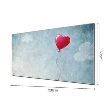 Material: 4mm Sicherheitsglas mit Metallrückwand Eigenschaften: beschreibbar, magnetisch, kratzfest Maße: 120x60x0,6cm, 10,80kg schwer Motiv Nummer 11282 Herzballon Zubehör: inklusive 4 Neodym-Magnete