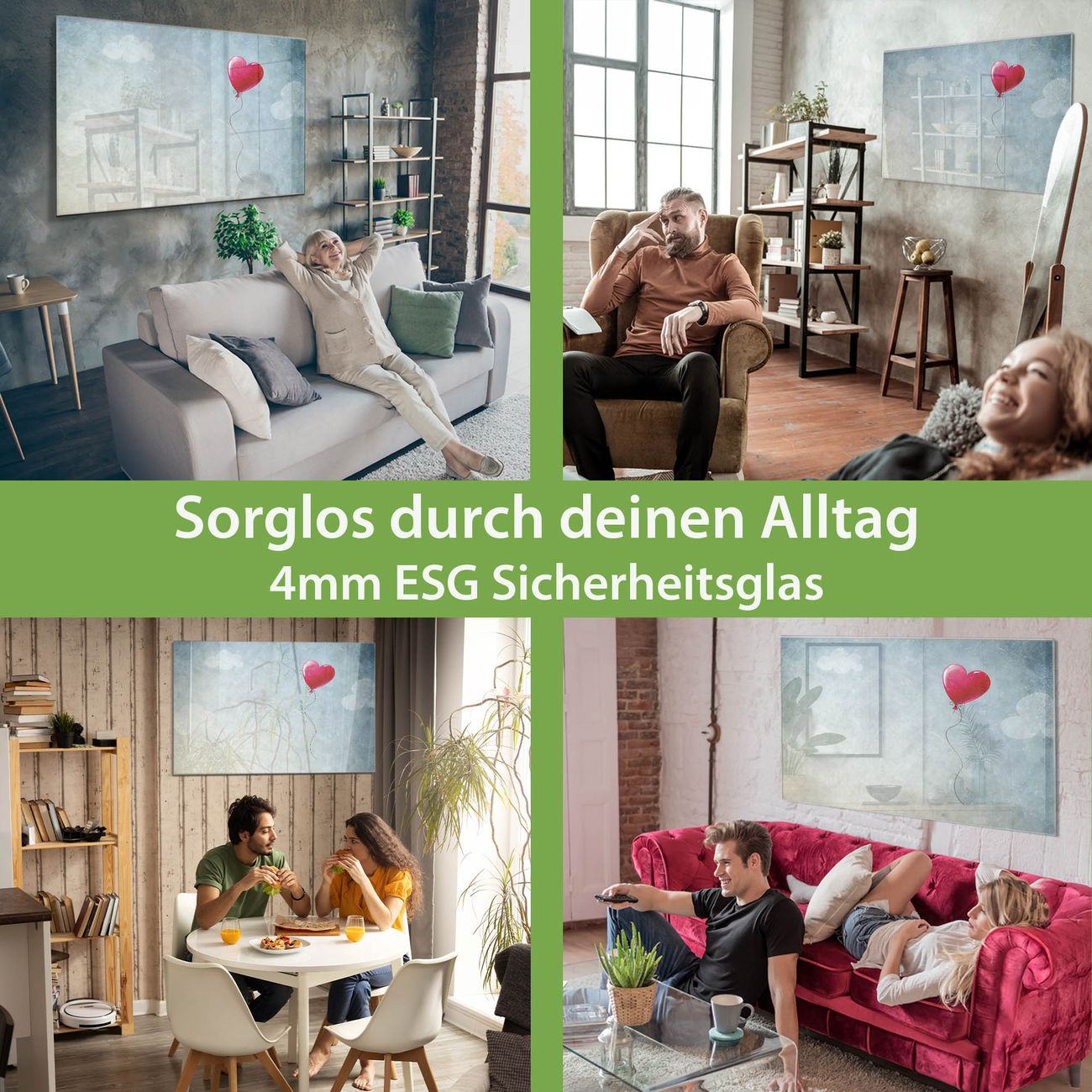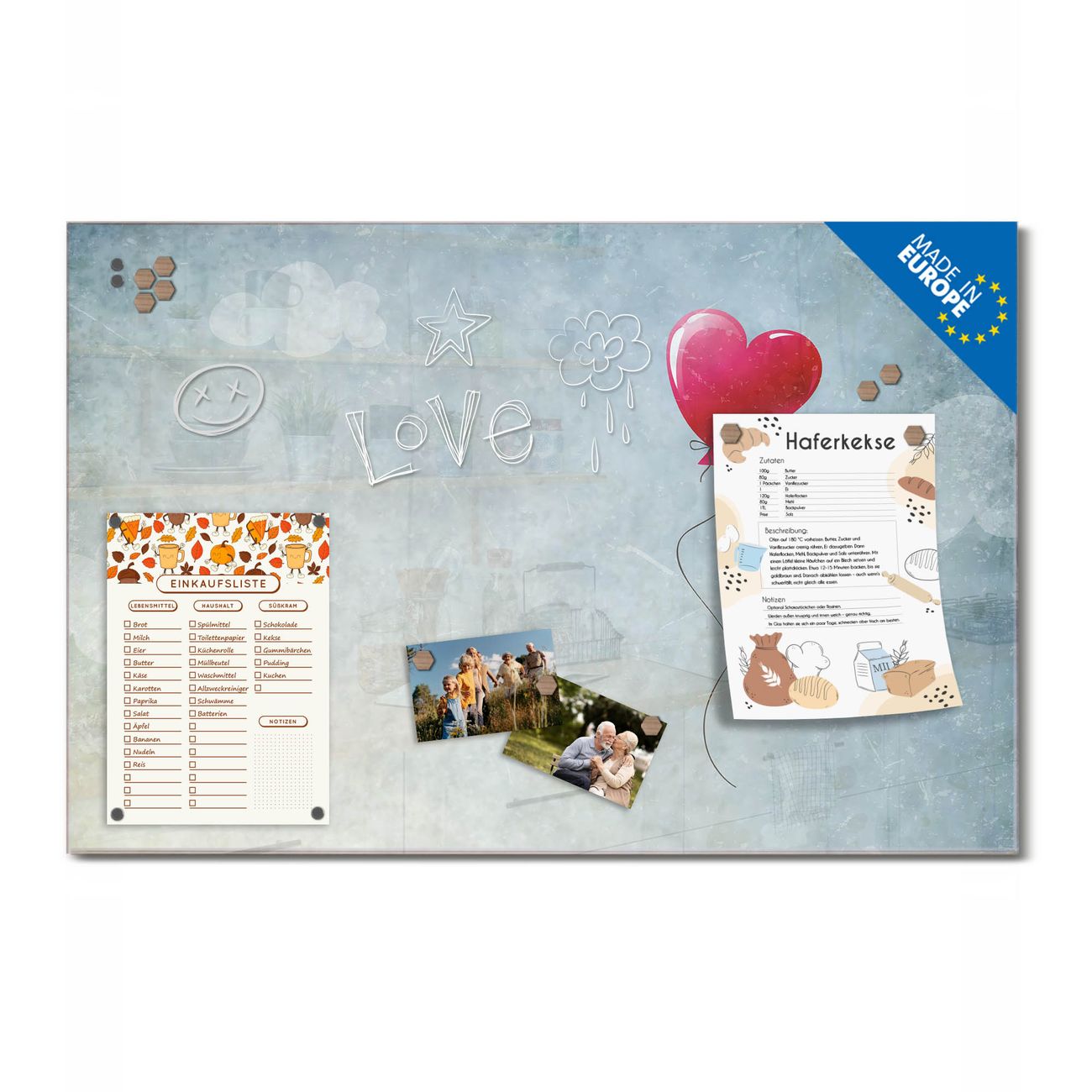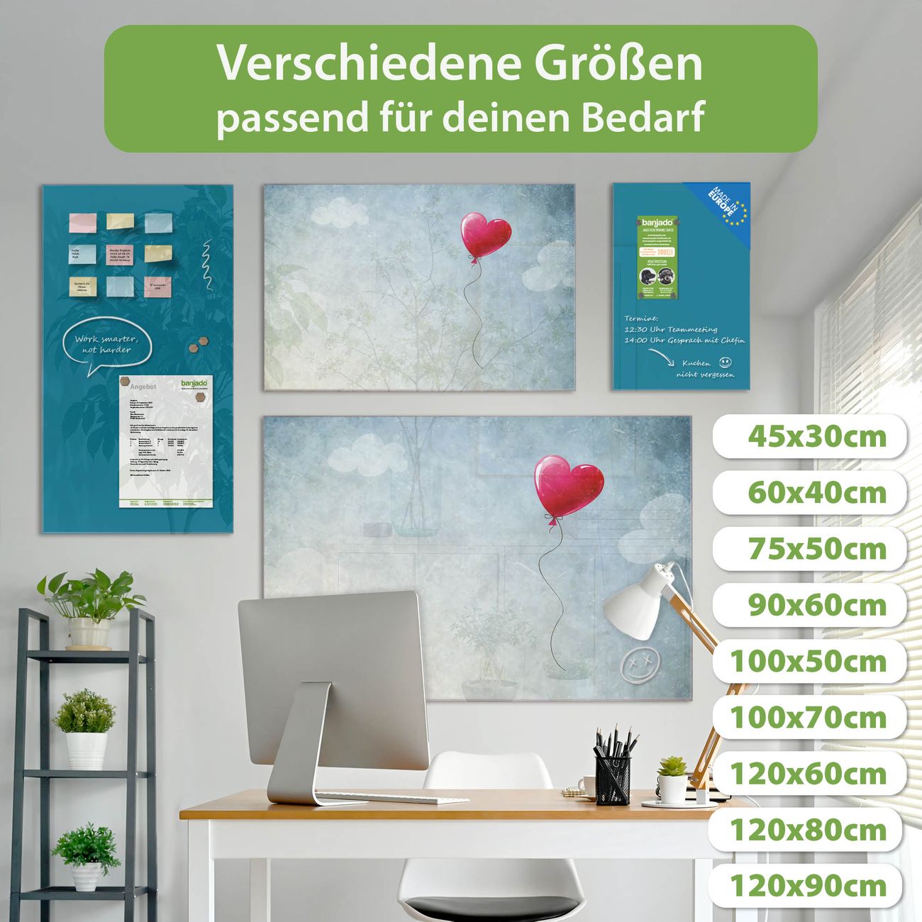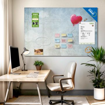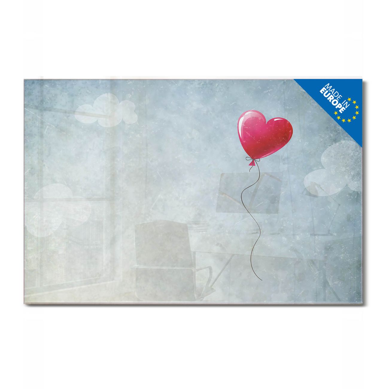 Material: 4mm Sicherheitsglas mit Metallrückwand Eigenschaften: beschreibbar, magnetisch, kratzfest Maße: 75x50x0,6cm, 5,63kg schwer Motiv Nummer 11282 Herzballon Zubehör: inklusive 4 Neodym-Magnete
