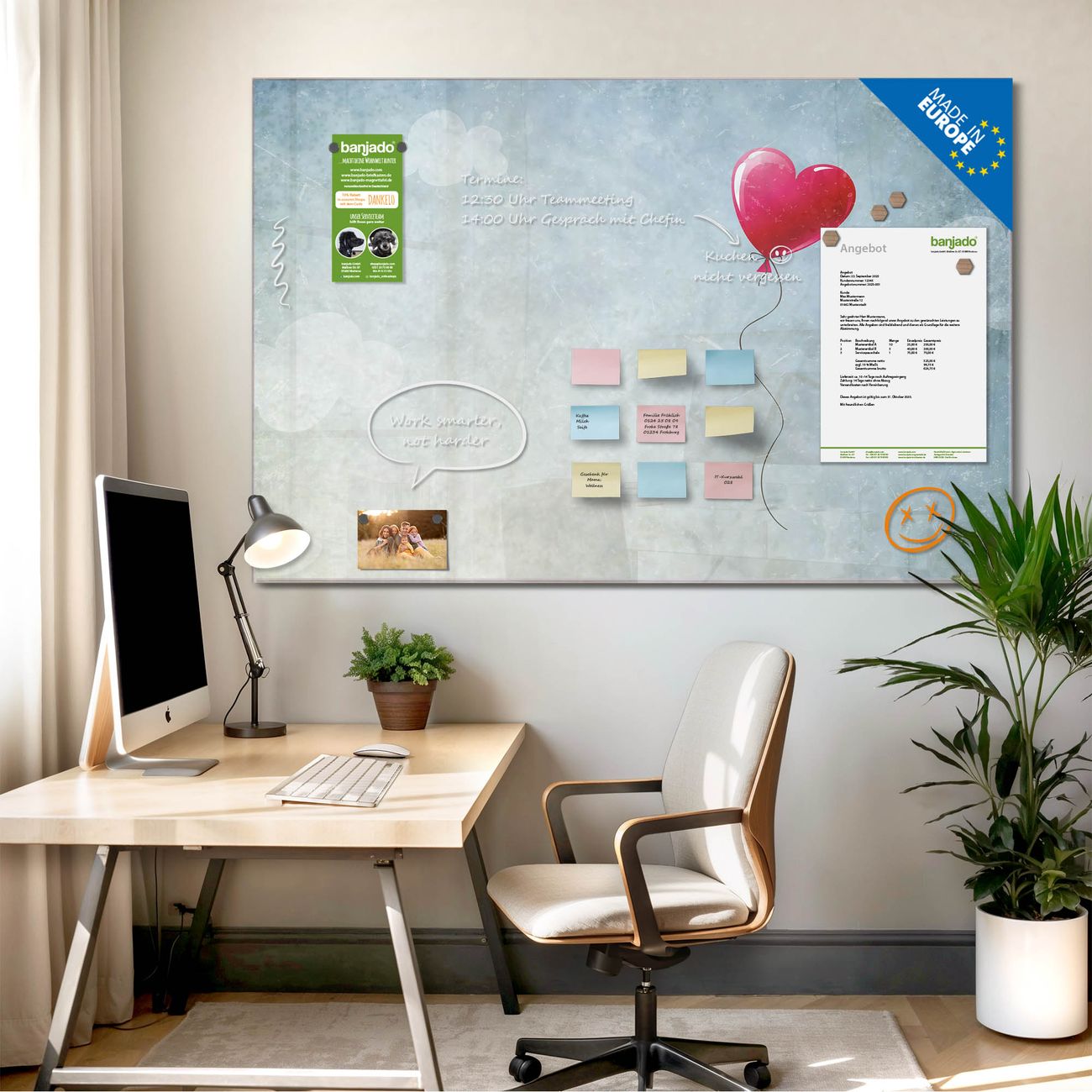 Ein Stück Design, das Ihren Alltag organisiert. Schreiben, heften, inspirieren - alles an einem Ort. Qualität, die man spürt. Montage leicht gemacht. Handwerk mit Herz - veredelt in Sachsen. Einzigartiges Design mit Motiv Motiv Herzballon Beschreibbare Glasoberfläche, leicht zu reinigen Starke Magnetkraft durch Stahlrückwand Inklusive 4 Neodym-Magneten Flexible Montageoptionen Handveredelt in Sachsen - Qualität, die bleibt