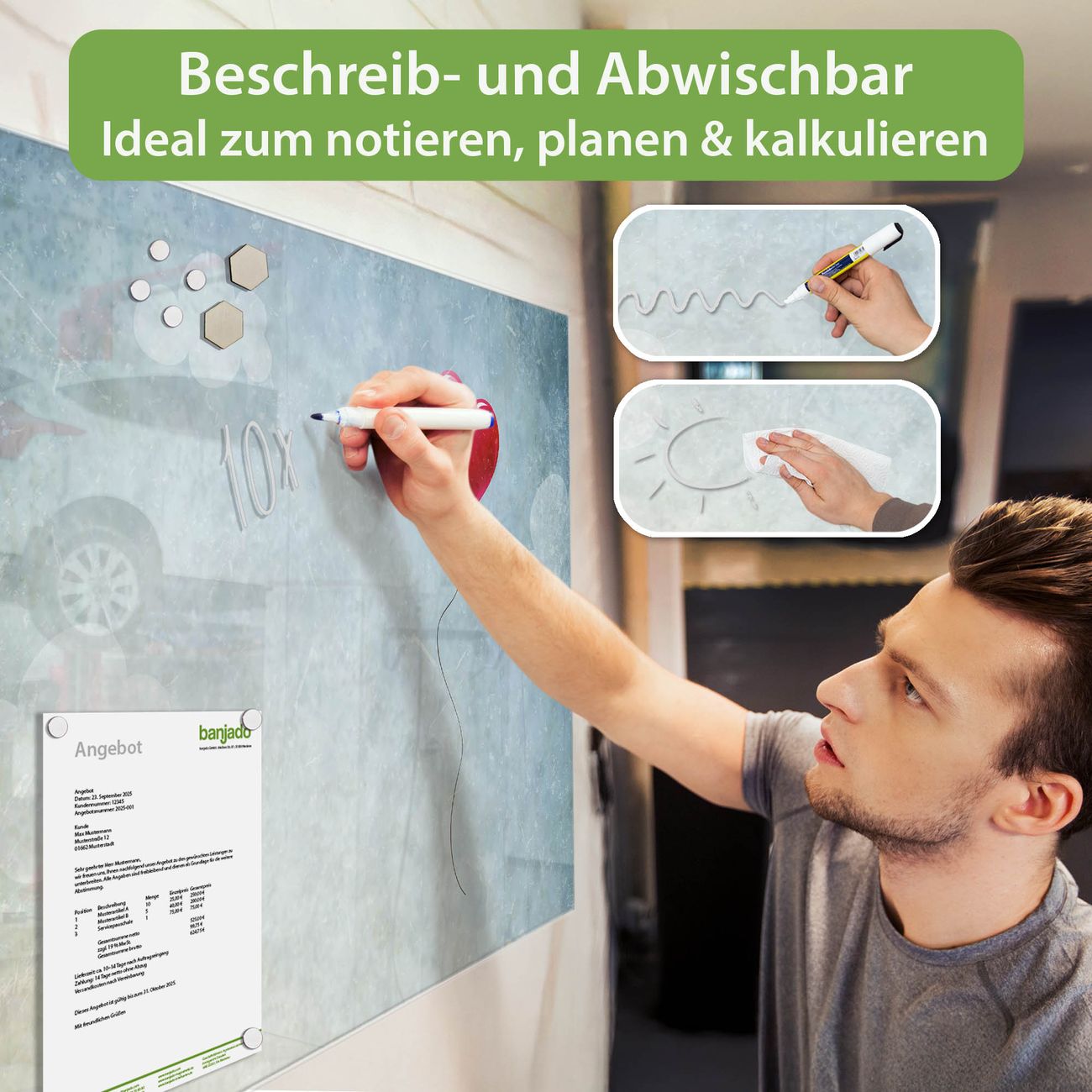 Auf der glatten Glasoberfläche lassen sich Termine, Rezepte oder Notizen ganz einfach mit Kreidestiften festhalten und rückstandslos entfernen. Starke Neodym-Magnete halten Ihre wichtigsten Erinnerungen sicher an Ort und Stelle. So entsteht Ihre ganz persönliche Ideenwand - jeden Tag neu.