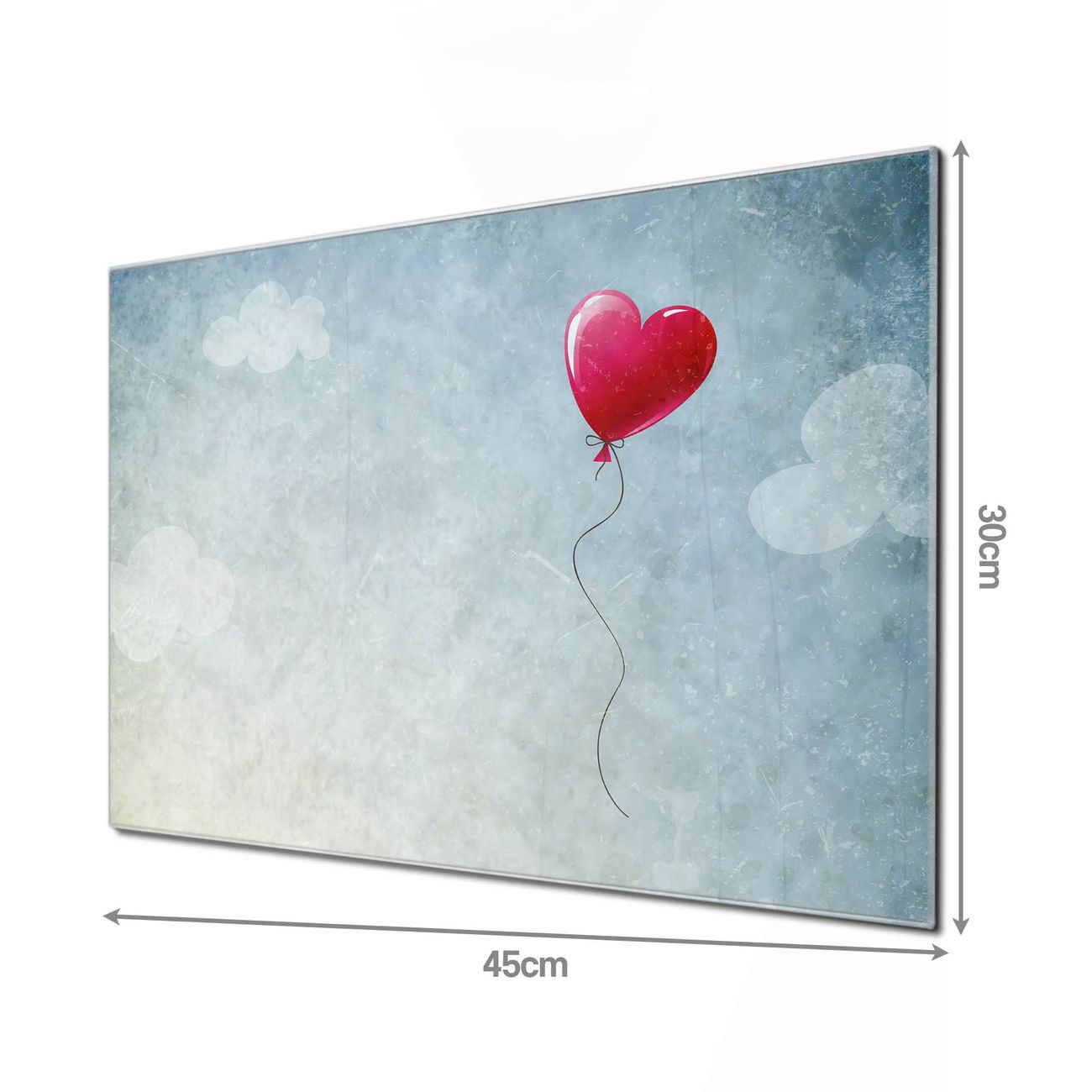 Material: 4mm Sicherheitsglas mit Metallrückwand Eigenschaften: beschreibbar, magnetisch, kratzfest Maße: 45x30x0,6cm, 2,03kg schwer Motiv Nummer 11282 Herzballon Zubehör: inklusive 4 Neodym-Magnete