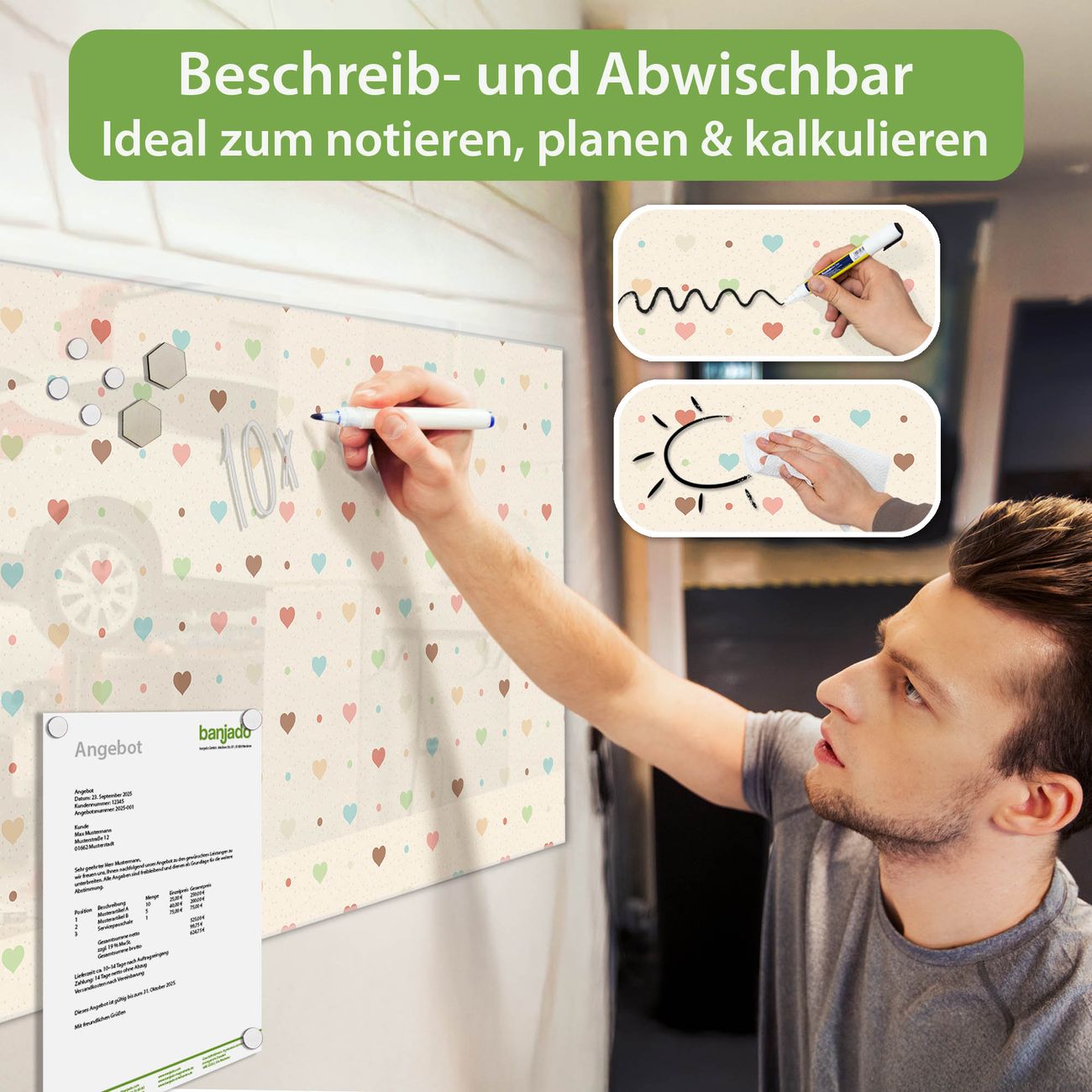 Die banjado Glas Magnettafel mit dem Motiv Motiv Herzen bunt verbindet Funktionalität mit Stil. Sie ersetzt das Zettelchaos durch klare Strukturen und bringt dabei eine warme, natürliche Atmosphäre in Ihr Zuhause. Ob im Büro, in der Küche oder im Eingangsbereich - dieses Design-Board zieht Blicke an und sorgt für Ordnung mit Charakter.
