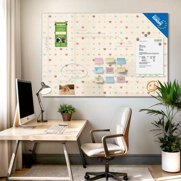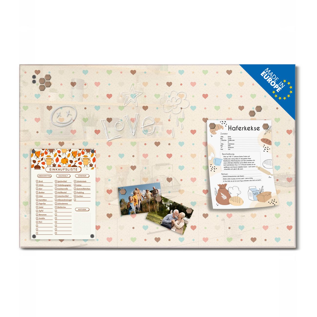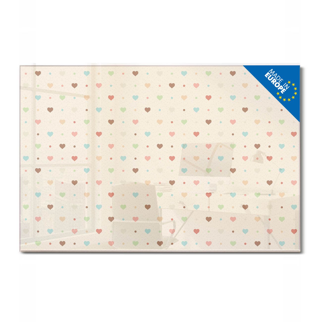 Material: 4mm Sicherheitsglas mit Metallrückwand Eigenschaften: beschreibbar, magnetisch, kratzfest Maße: 45x30x0,6cm, 2,03kg schwer Motiv Nummer 11526 Herzen bunt Zubehör: inklusive 4 Neodym-Magnete