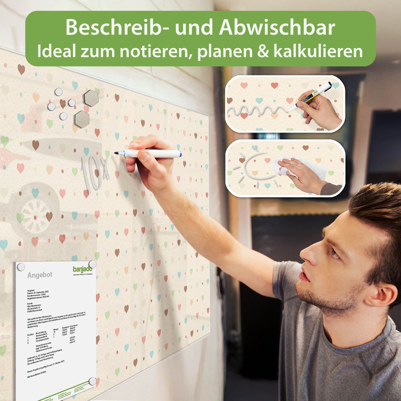 Die banjado Glas Magnettafel mit dem Motiv Motiv Herzen bunt verbindet Funktionalität mit Stil. Sie ersetzt das Zettelchaos durch klare Strukturen und bringt dabei eine warme, natürliche Atmosphäre in Ihr Zuhause. Ob im Büro, in der Küche oder im Eingangsbereich - dieses Design-Board zieht Blicke an und sorgt für Ordnung mit Charakter.
