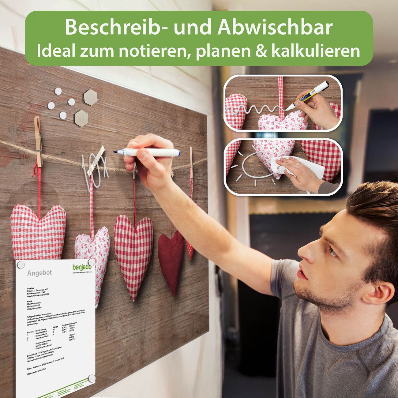 Bitte beachten Sie, dass ausschliessliche spezielle Magnete an der Glastafel haften. Wir empfehlen banjado Neodym Magnete, diese sind durch uns auf Wirksamkeit geprüft.