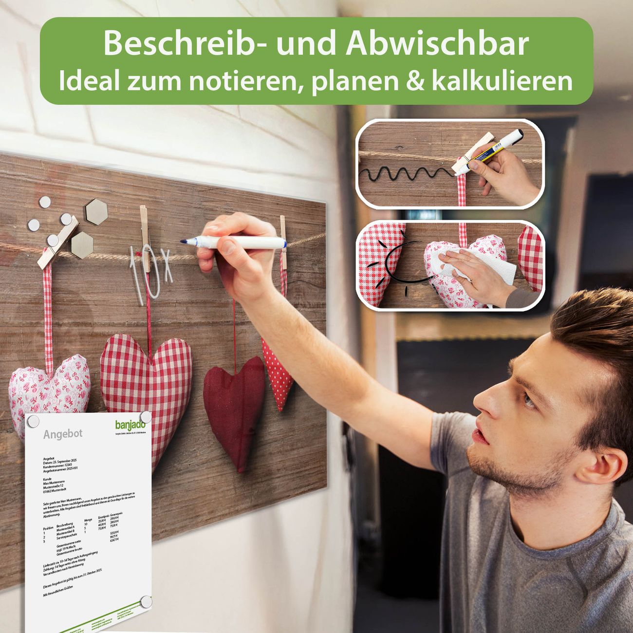 Auf der glatten Glasoberfläche lassen sich Termine, Rezepte oder Notizen ganz einfach mit Kreidestiften festhalten und rückstandslos entfernen. Starke Neodym-Magnete halten Ihre wichtigsten Erinnerungen sicher an Ort und Stelle. So entsteht Ihre ganz persönliche Ideenwand - jeden Tag neu.
