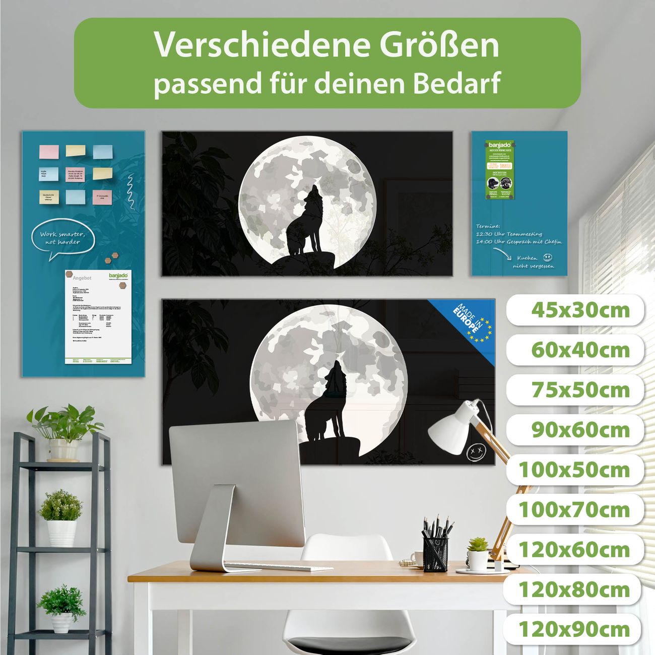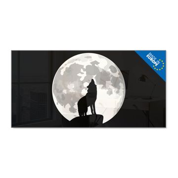 Material: 4mm Sicherheitsglas mit Metallrückwand Eigenschaften: beschreibbar, magnetisch, kratzfest Maße: 100x50x0,6cm, 7,50kg schwer Motiv Nummer 11023 Heulender Wolf SW Zubehör: inklusive 4 Neodym-Magnete