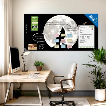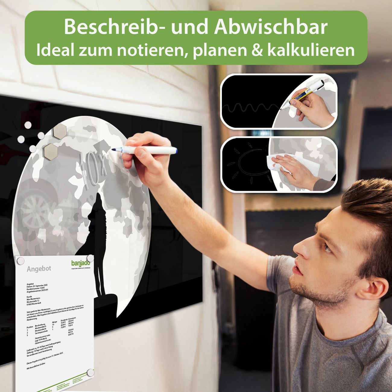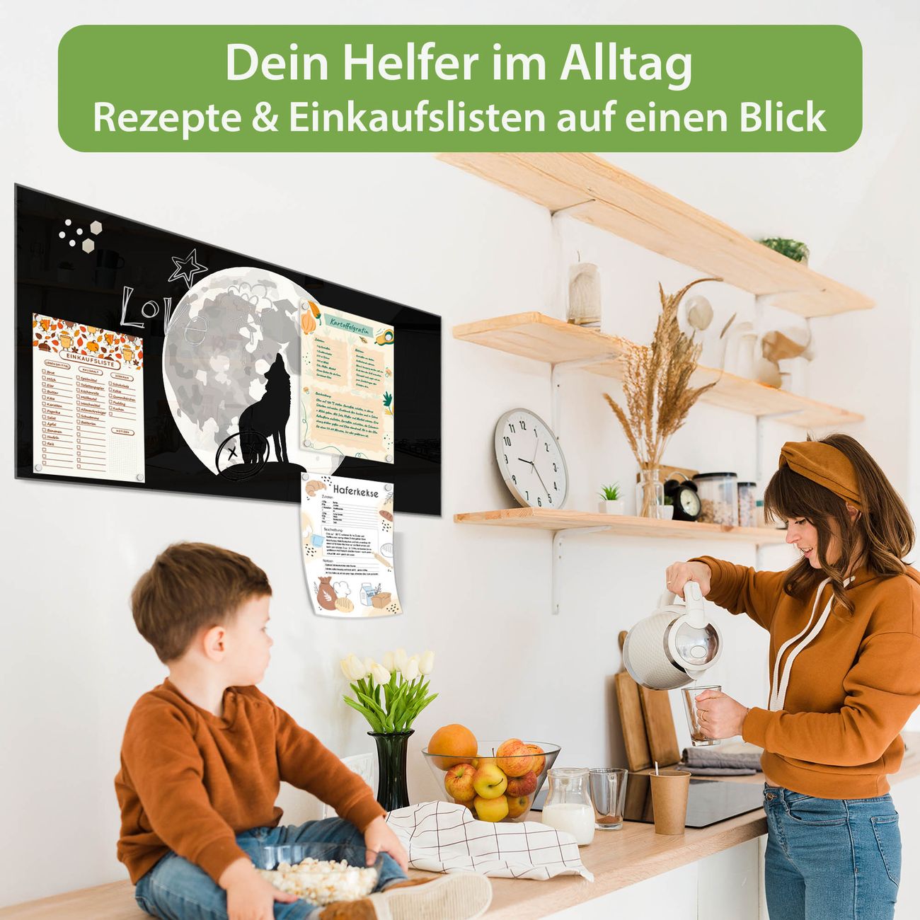 Auf der glatten Glasoberfläche lassen sich Termine, Rezepte oder Notizen ganz einfach mit Kreidestiften festhalten und rückstandslos entfernen. Starke Neodym-Magnete halten Ihre wichtigsten Erinnerungen sicher an Ort und Stelle. So entsteht Ihre ganz persönliche Ideenwand - jeden Tag neu.