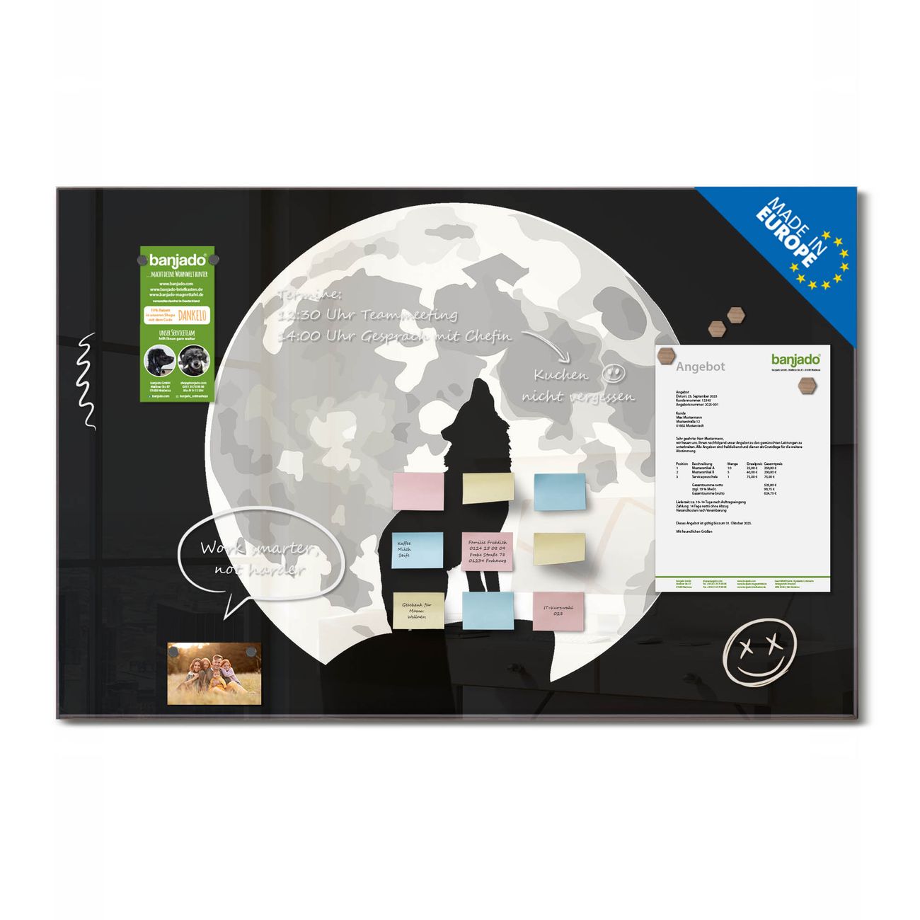 Jede Glas Magnettafel wird in unserer Werkstatt von Hand gefertigt und sorgfältig geprüft. So erhalten Sie ein echtes Qualitätsprodukt, das Funktion und Ästhetik perfekt vereint.?? Warum banjado?