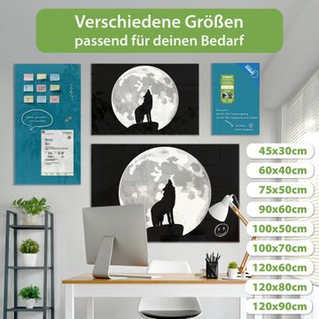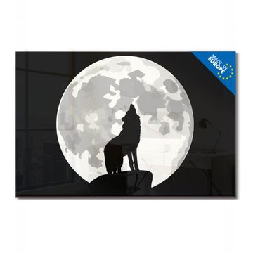 Material: 4mm Sicherheitsglas mit Metallrückwand Eigenschaften: beschreibbar, magnetisch, kratzfest Maße: 90x60x0,6cm, 8,10kg schwer Motiv Nummer 11023 Heulender Wolf SW Zubehör: inklusive 4 Neodym-Magnete