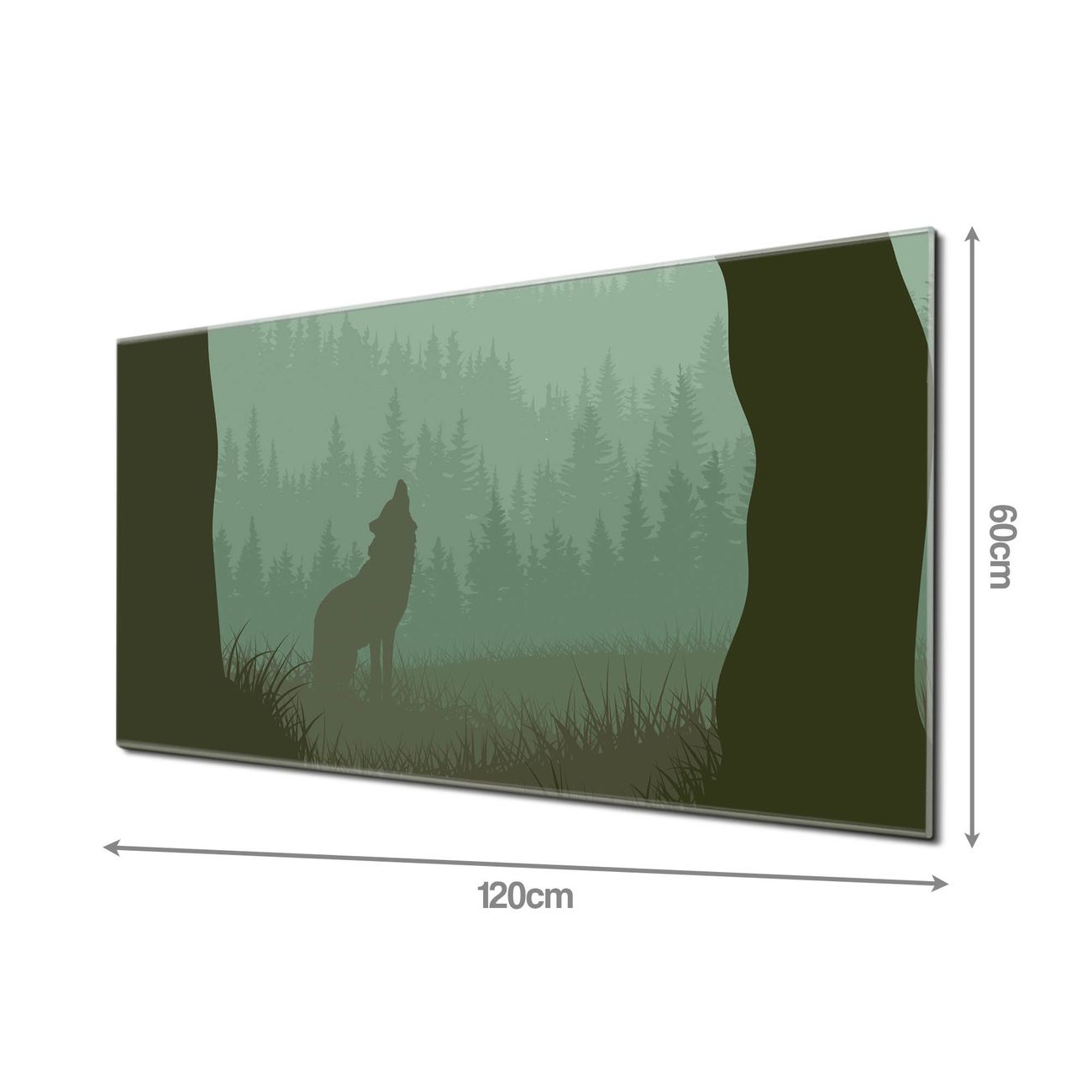 Material: 4mm Sicherheitsglas mit Metallrückwand Eigenschaften: beschreibbar, magnetisch, kratzfest Maße: 120x60x0,6cm, 10,80kg schwer Motiv Nummer 11022 Heulender Wolf Zubehör: inklusive 4 Neodym-Magnete