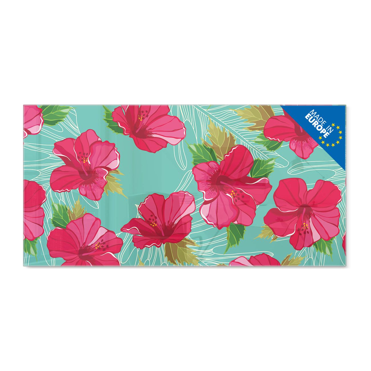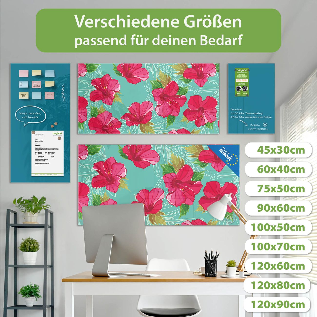 Material: 4mm Sicherheitsglas mit Metallrückwand Eigenschaften: beschreibbar, magnetisch, kratzfest Maße: 120x60x0,6cm, 10,80kg schwer Motiv Nummer 11184 Hibiskus Zubehör: inklusive 4 Neodym-Magnete