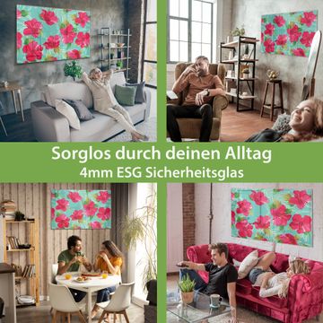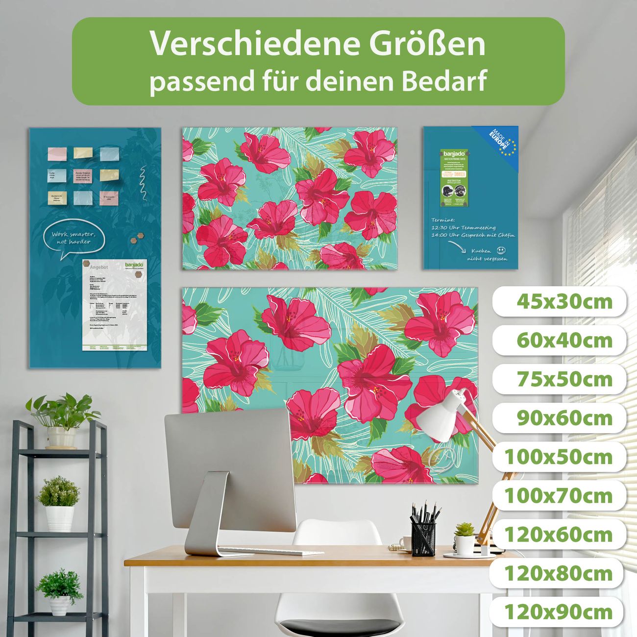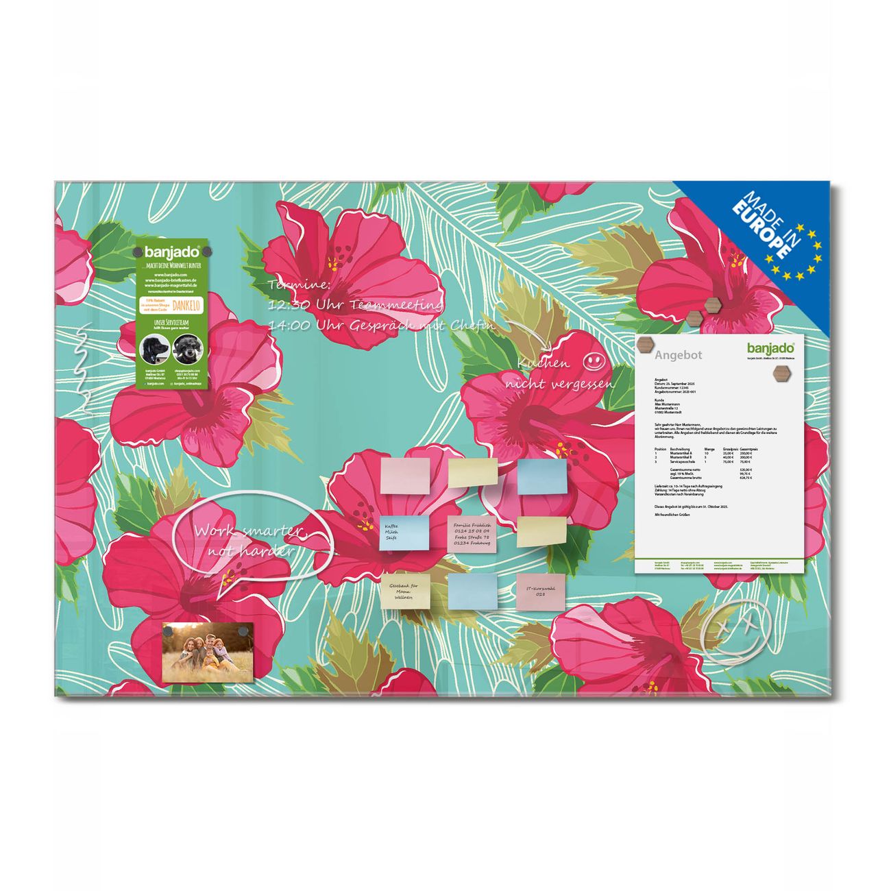 Material: 4mm Sicherheitsglas mit Metallrückwand Eigenschaften: beschreibbar, magnetisch, kratzfest Maße: 120x80x0,6cm, 14,40kg schwer Motiv Nummer 11184 Hibiskus Zubehör: inklusive 4 Neodym-Magnete
