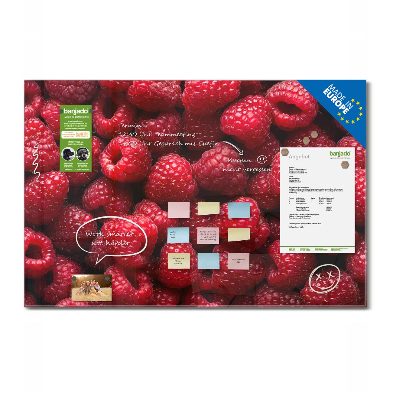 Ein Stück Design, das Ihren Alltag organisiert. Schreiben, heften, inspirieren - alles an einem Ort. Qualität, die man spürt. Montage leicht gemacht. Handwerk mit Herz - veredelt in Sachsen. Einzigartiges Design mit Motiv Motiv Himbeeren Beschreibbare Glasoberfläche, leicht zu reinigen Starke Magnetkraft durch Stahlrückwand Inklusive 4 Neodym-Magneten Flexible Montageoptionen Handveredelt in Sachsen - Qualität, die bleibt