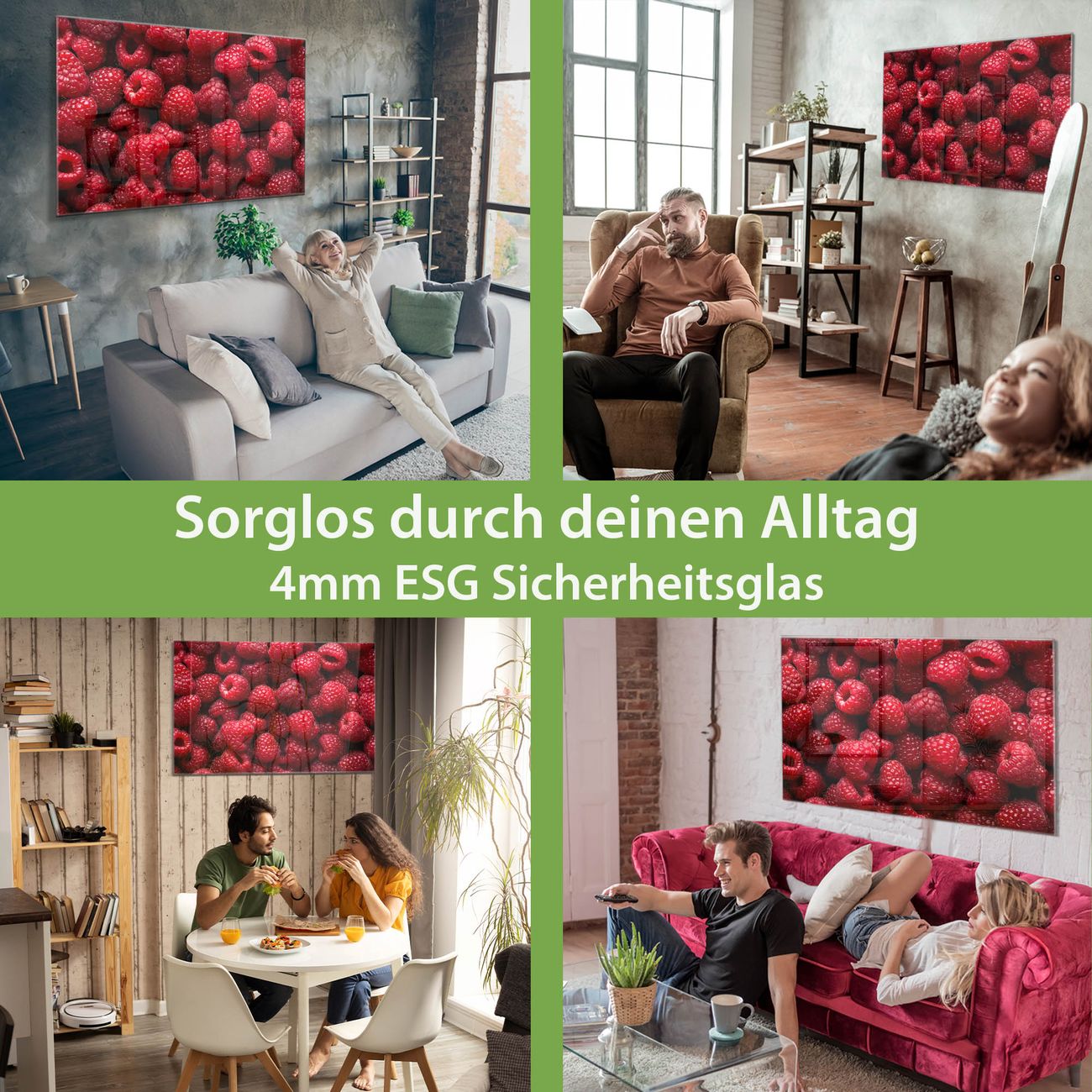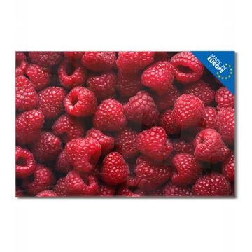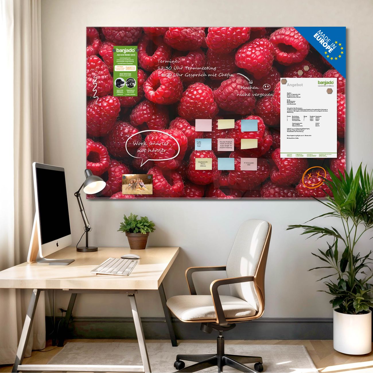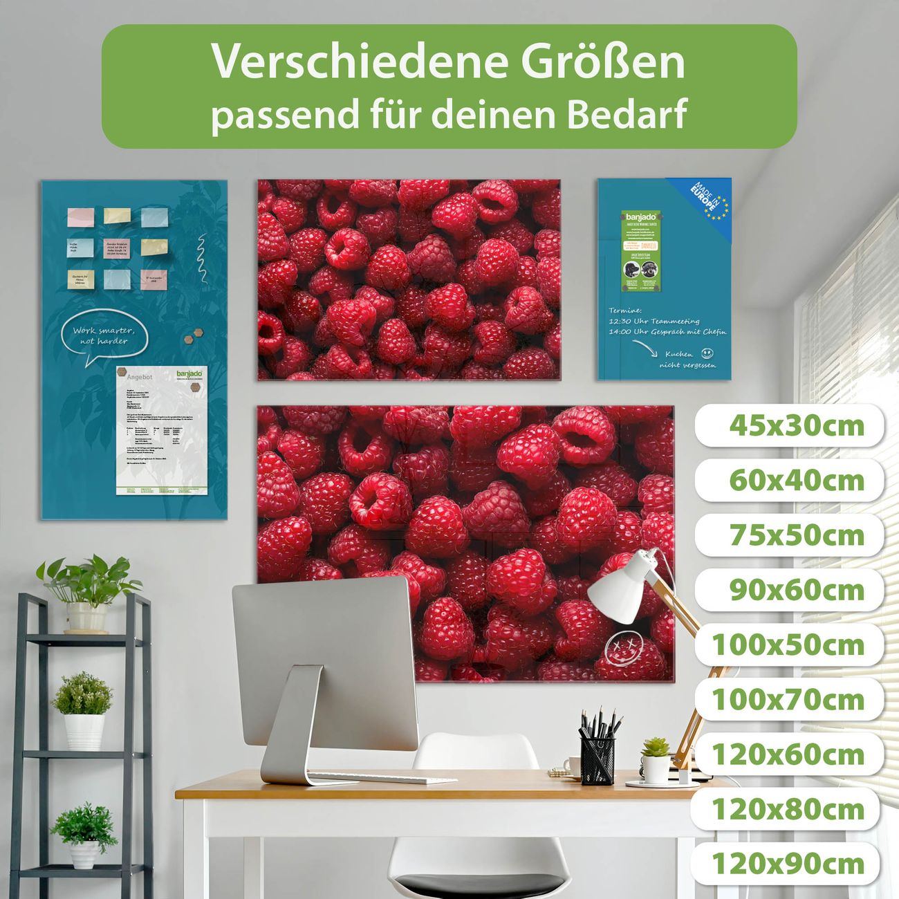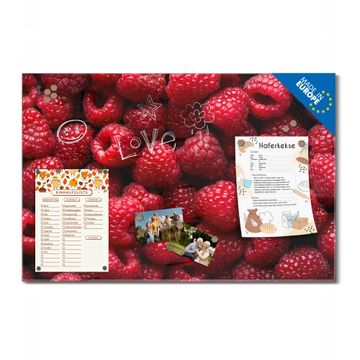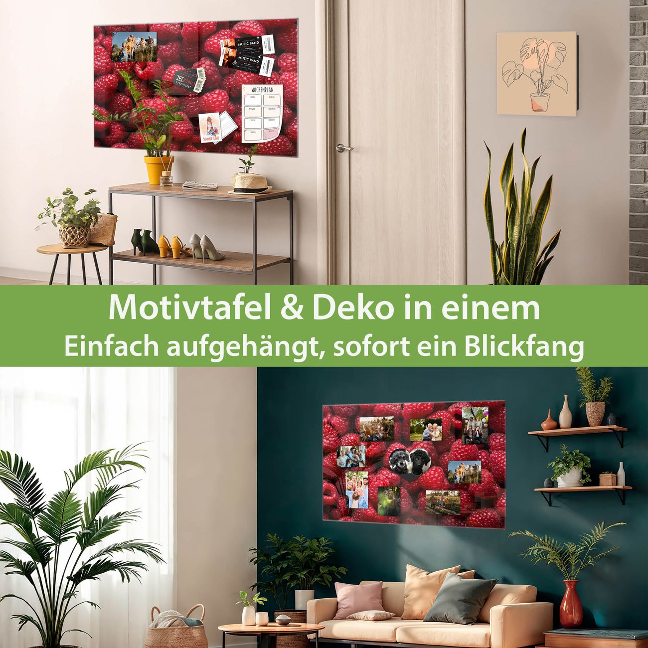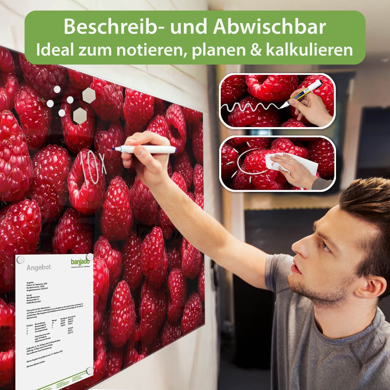 Material: 4mm Sicherheitsglas mit Metallrückwand Eigenschaften: beschreibbar, magnetisch, kratzfest Maße: 75x50x0,6cm, 5,63kg schwer Motiv Nummer 11600 Himbeeren Zubehör: inklusive 4 Neodym-Magnete
