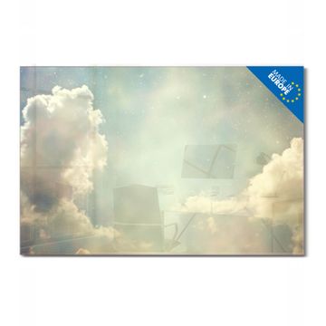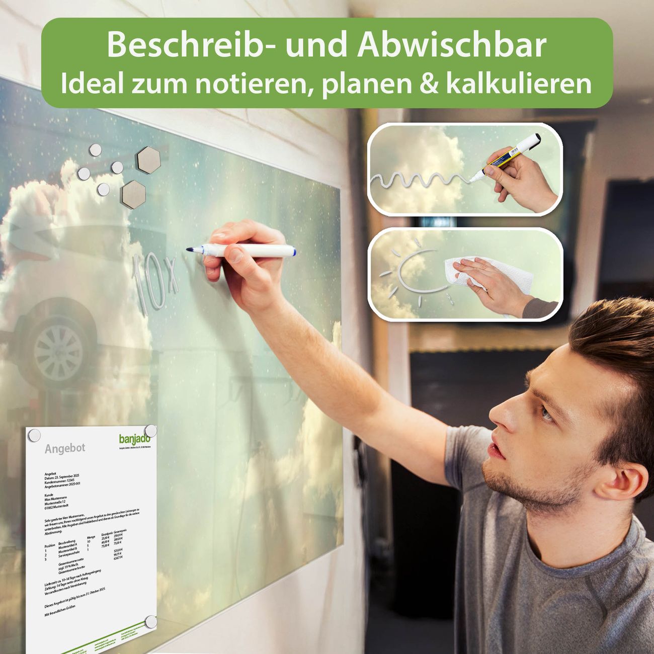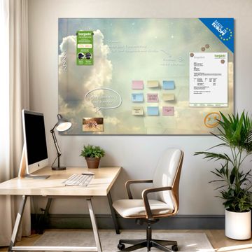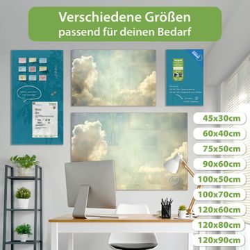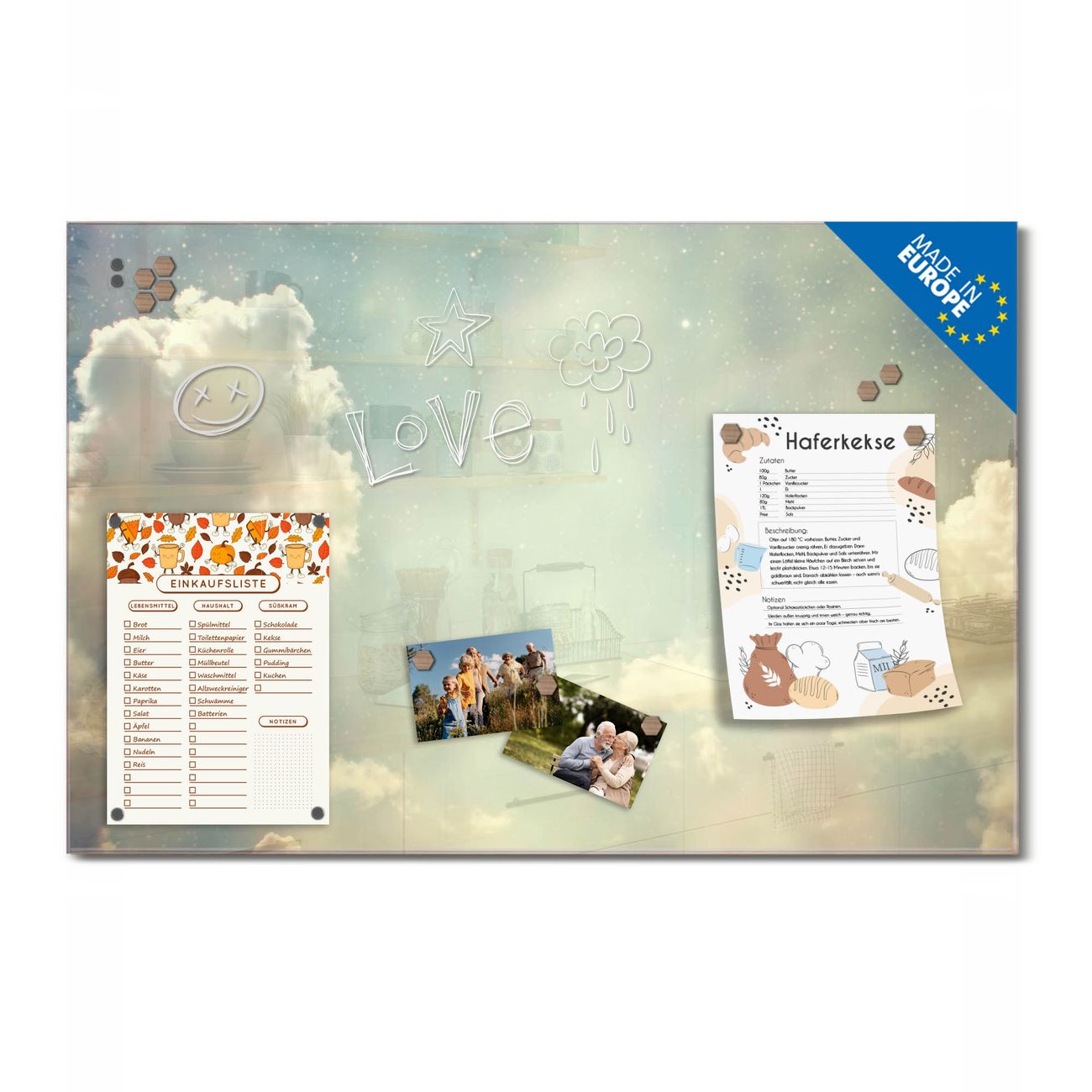 Material: 4mm Sicherheitsglas mit Metallrückwand Eigenschaften: beschreibbar, magnetisch, kratzfest Maße: 60x40x0,6cm, 3,6kg schwer Motiv Nummer 12290 Himmel Vintage Zubehör: inklusive 4 Neodym-Magnete