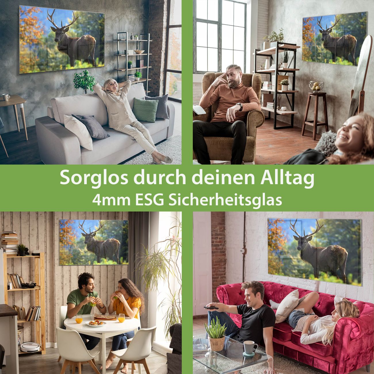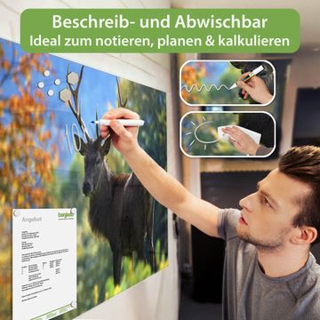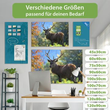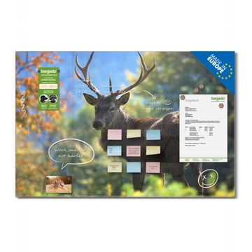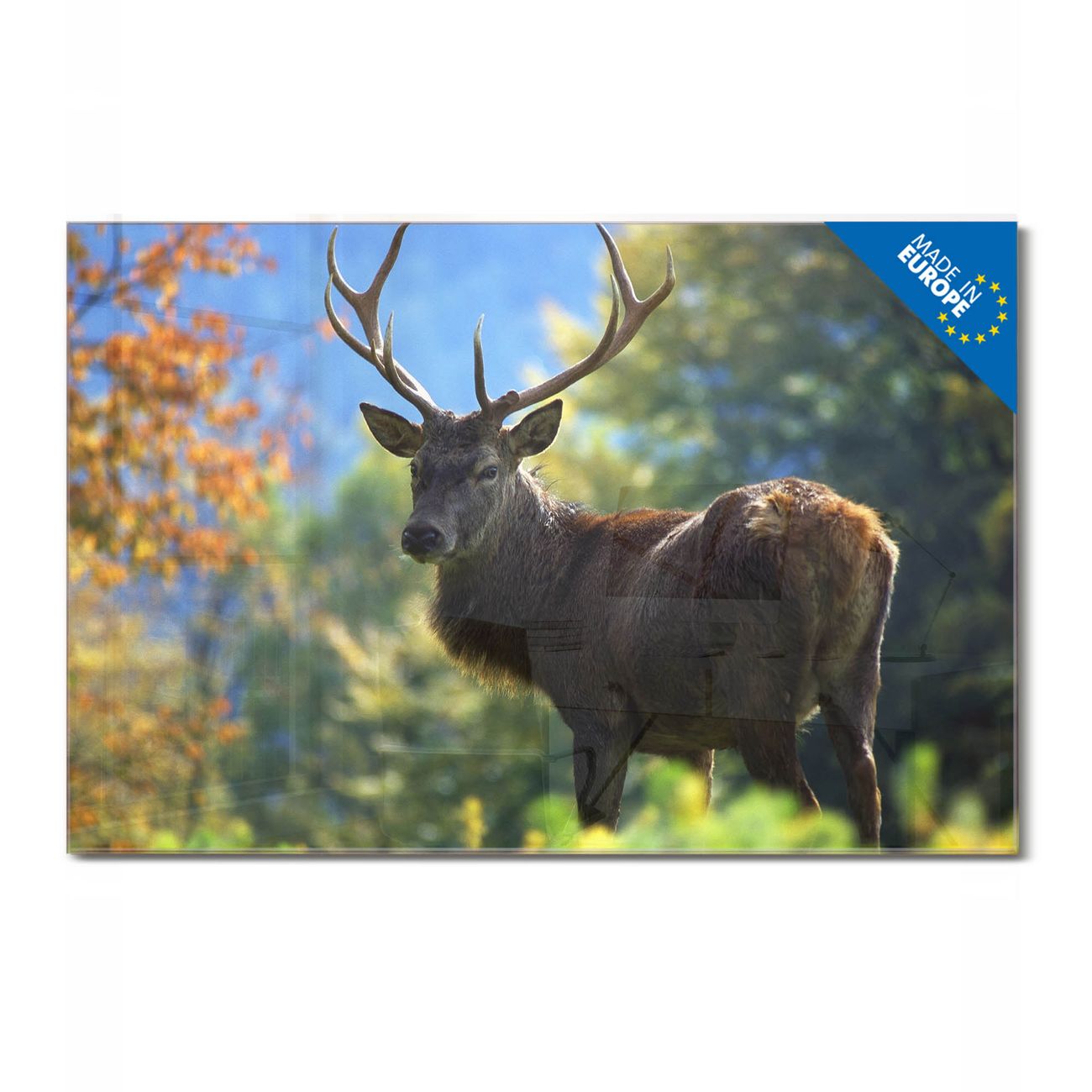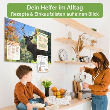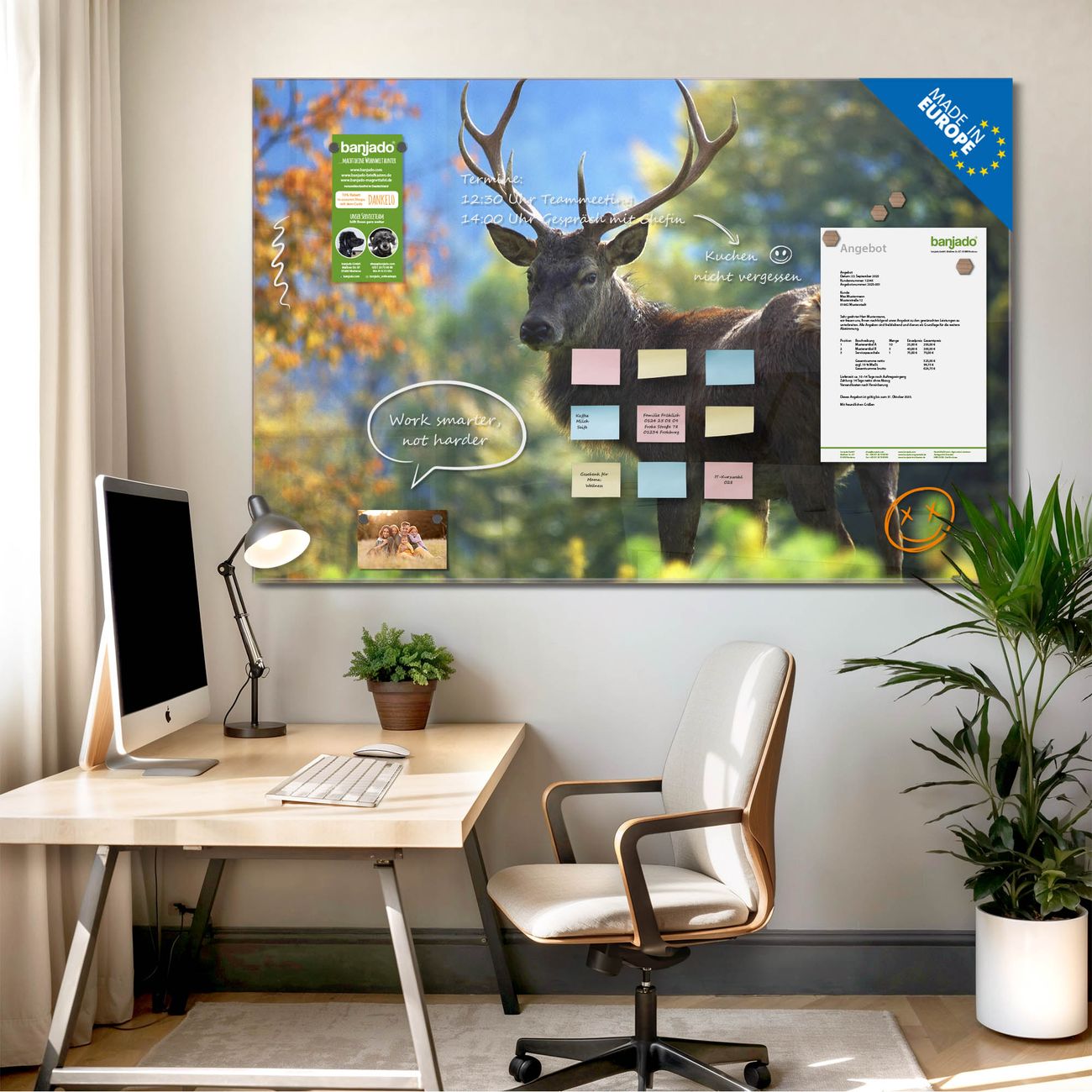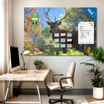 Material: 4mm Sicherheitsglas mit Metallrückwand Eigenschaften: beschreibbar, magnetisch, kratzfest Maße: 90x60x0,6cm, 8,10kg schwer Motiv Nummer 10321 Hirsch Zubehör: inklusive 4 Neodym-Magnete