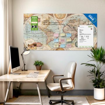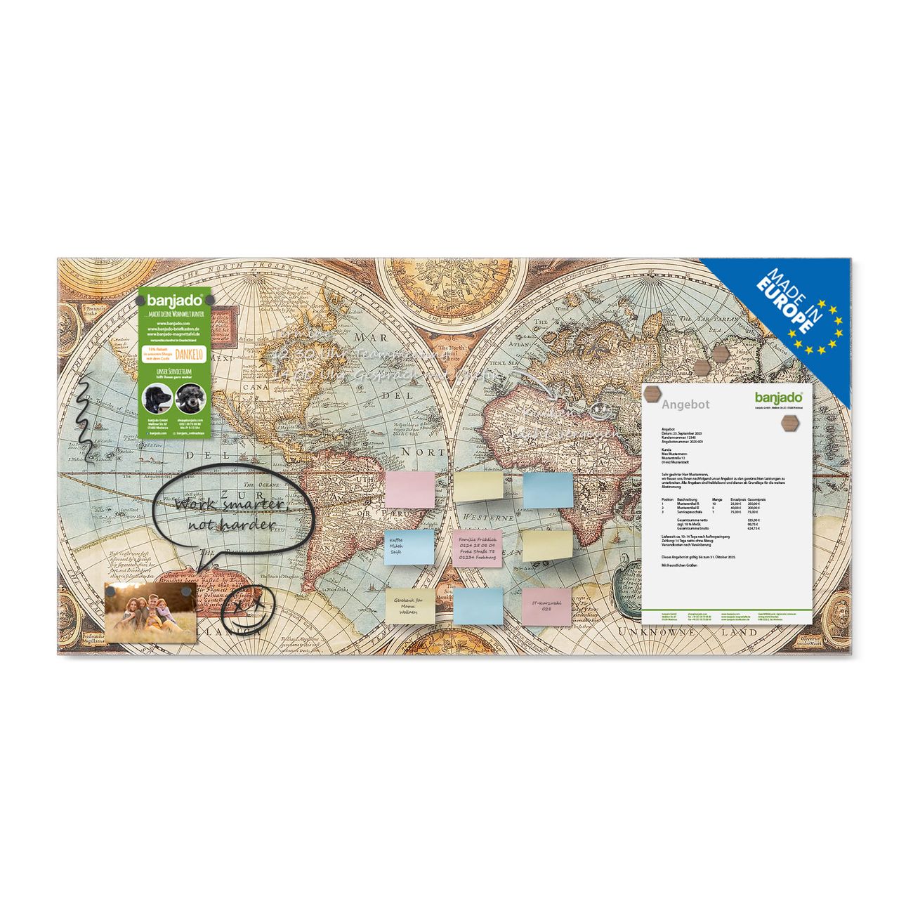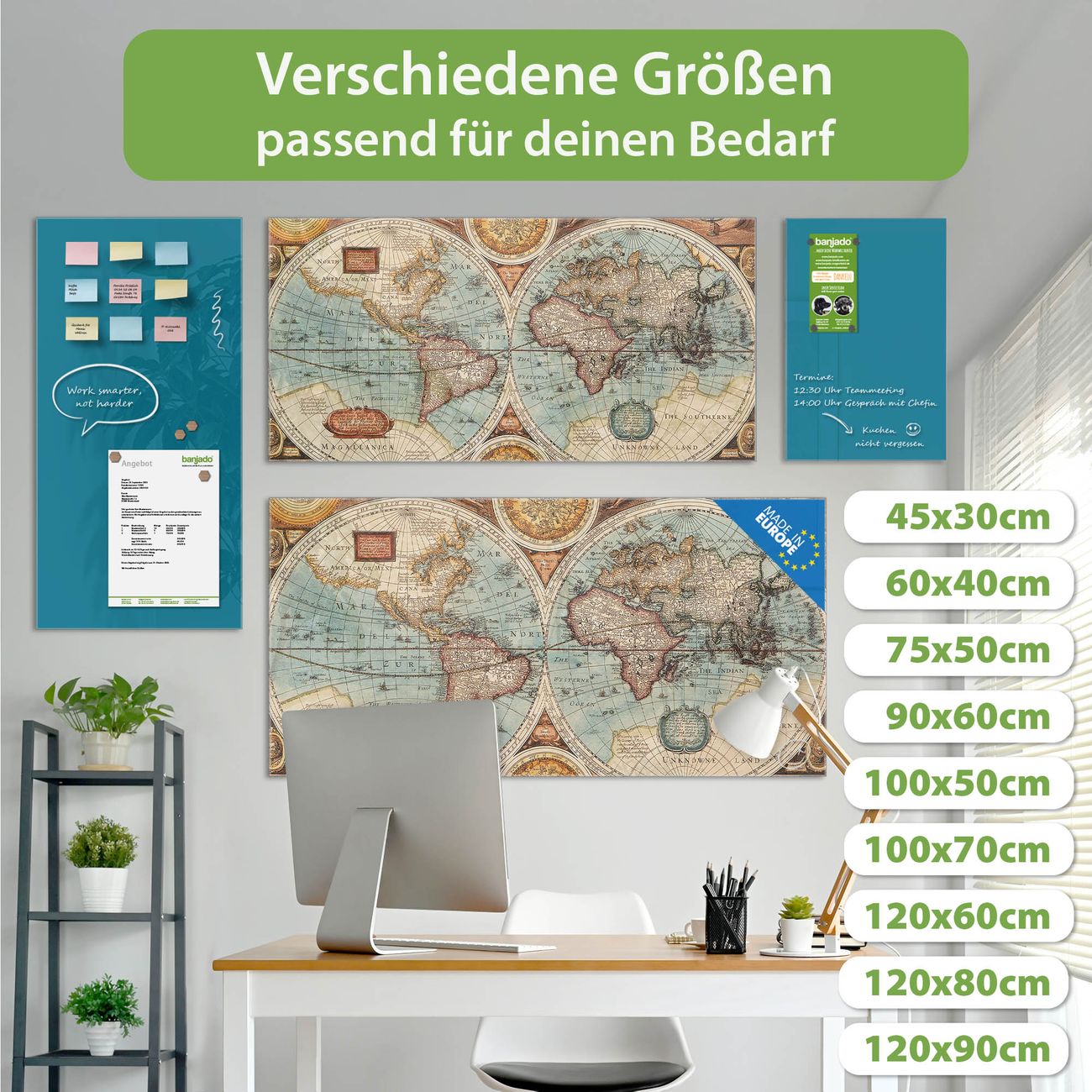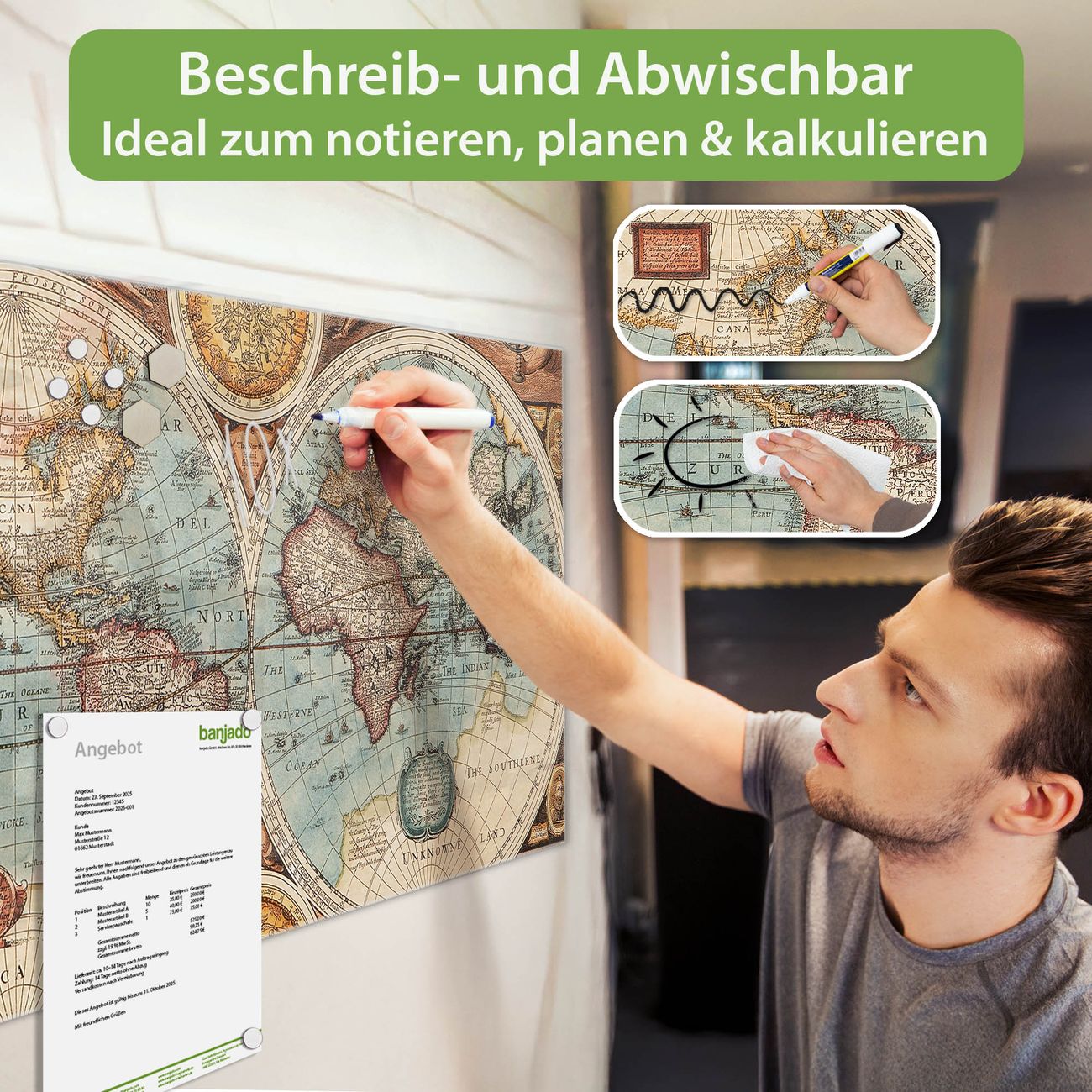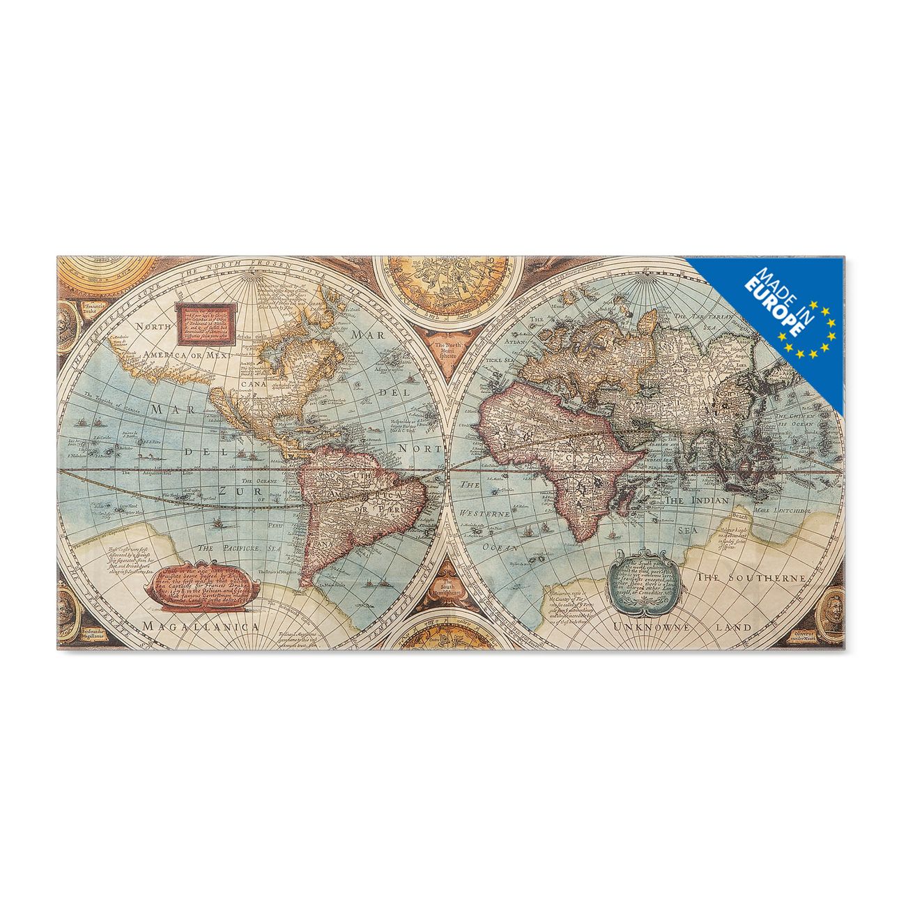 Material: 4mm Sicherheitsglas mit Metallrückwand Eigenschaften: beschreibbar, magnetisch, kratzfest Maße: 100x50x0,6cm, 7,50kg schwer Motiv Nummer 10550 Historische Weltkarte Zubehör: inklusive 4 Neodym-Magnete