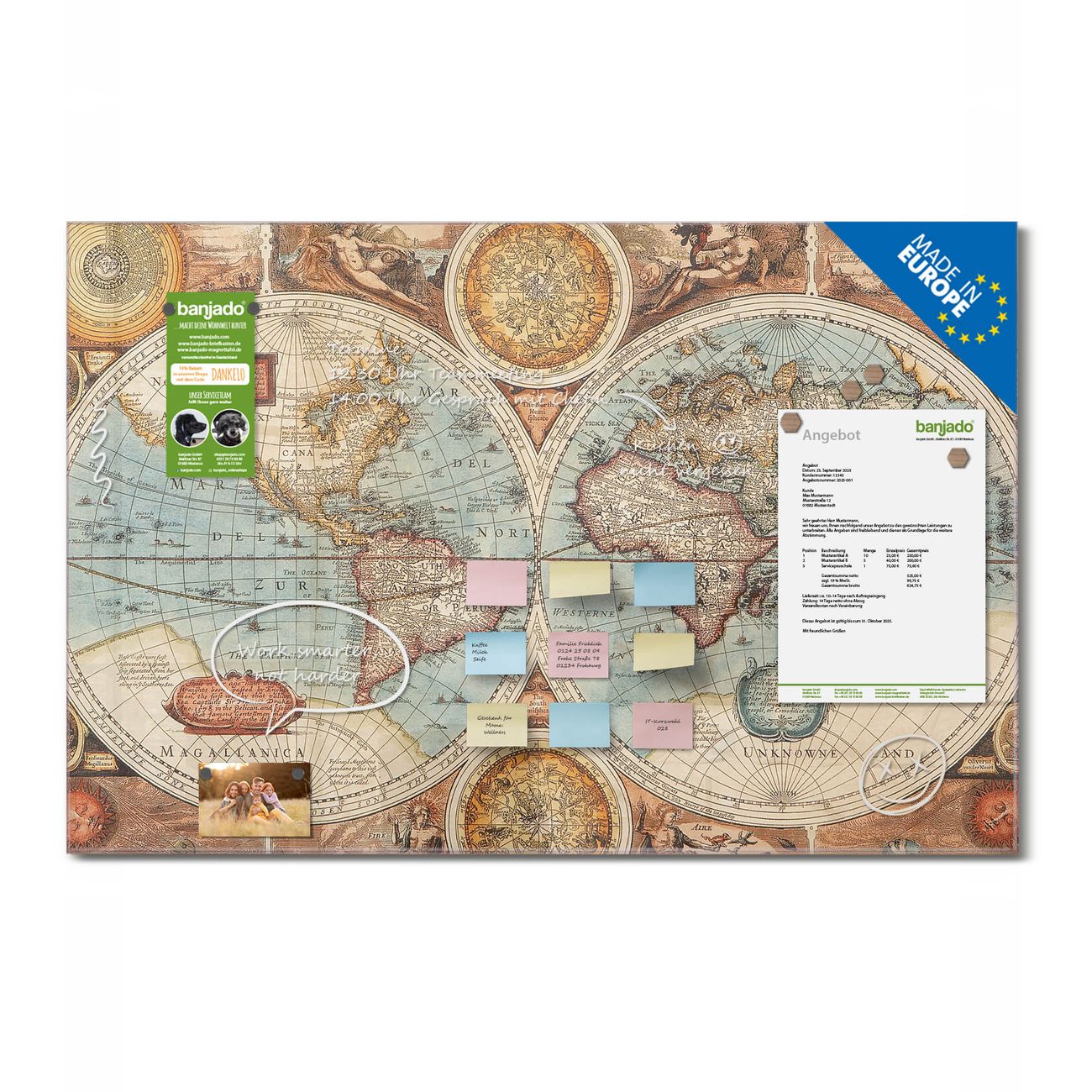Jede Glas Magnettafel wird in unserer Werkstatt von Hand gefertigt und sorgfältig geprüft. So erhalten Sie ein echtes Qualitätsprodukt, das Funktion und Ästhetik perfekt vereint.?? Warum banjado?