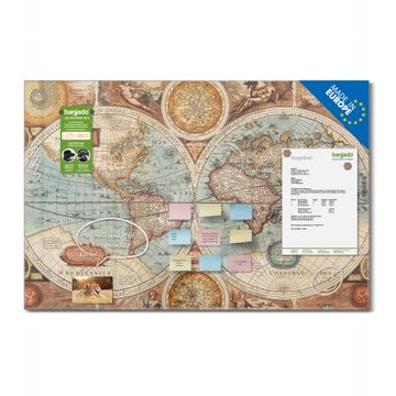 Material: 4mm Sicherheitsglas mit Metallrückwand Eigenschaften: beschreibbar, magnetisch, kratzfest Maße: 120x80x0,6cm, 14,40kg schwer Motiv Nummer 10550 Historische Weltkarte Zubehör: inklusive 4 Neodym-Magnete