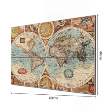 Material: 4mm Sicherheitsglas mit Metallrückwand Eigenschaften: beschreibbar, magnetisch, kratzfest Maße: 60x40x0,6cm, 3,6kg schwer Motiv Nummer 10550 Historische Weltkarte Zubehör: inklusive 4 Neodym-Magnete