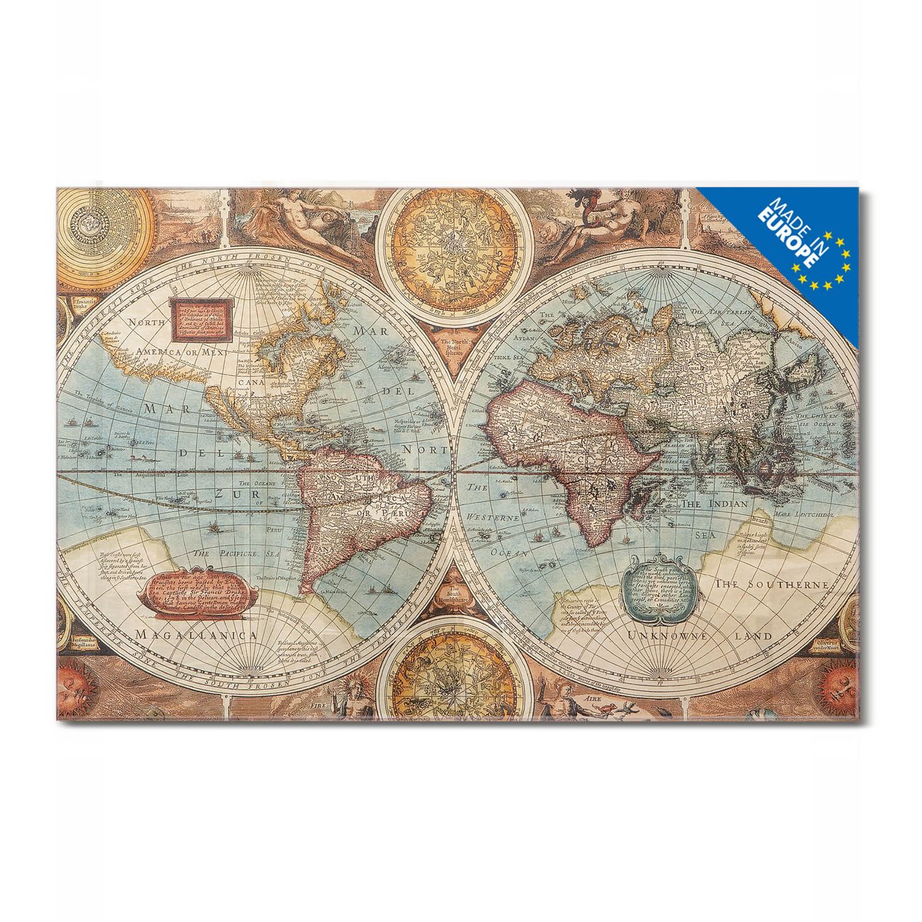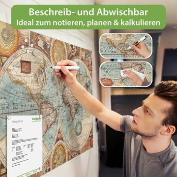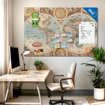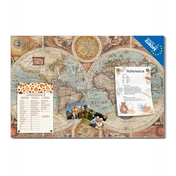 Material: 4mm Sicherheitsglas mit Metallrückwand Eigenschaften: beschreibbar, magnetisch, kratzfest Maße: 75x50x0,6cm, 5,63kg schwer Motiv Nummer 10550 Historische Weltkarte Zubehör: inklusive 4 Neodym-Magnete